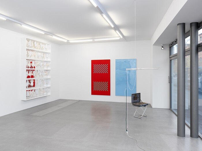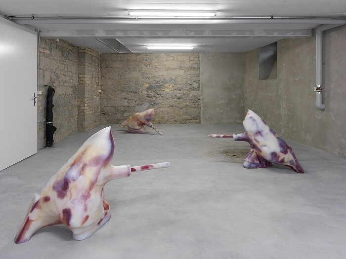 Despite this Swiss-style “umbilical cord of gold,”1 the grouping of artists on view does retain a basis in the local, pairing emerging talents such as Mitchell Anderson and Ramaya Tegegne with more internationally established artists like Jon Rafman. The former are presences on the local scene who also run some of the most interesting off-spaces in Switzerland—Plymouth Rock in Zurich and Forde in Geneva, respectively. The show thus mirrors as much as concretizes the correlation of interests practiced by its bigger neighbors across the street.