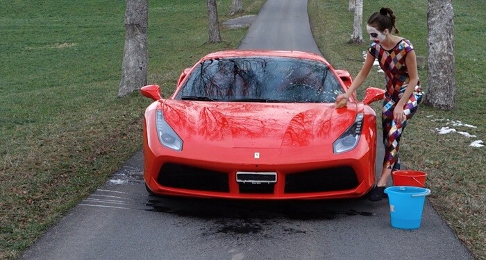 The opposite type of adaptive and calculating creative “labor” is depicted in Miriam Laura Leonardi’s performative video Car (2015). A flat screen lying directly on the floor facing the outside of the gallery projects the car back onto the street for maximum exposure to the public gaze. Donning a shimmering leotard—part-harlequin, part-shabby-Cirque de Soleil—combined with scary-clown make-up, the young artist placidly details a classic red Ferrari parked right in the middle of a tree-lined Old Money street in the Swiss countryside. Is it still true that “the avant-garde remain[s] attached to bourgeois society precisely because it need[s] its money”?3 Sure. But “jesters do oft prove prophets.”4 The character in Car signals an artistic subjectivity professionalized—or jaded—to the extent that it enjoys juggling the critical expectations of academia and institutions with the whimsies of their patrons.