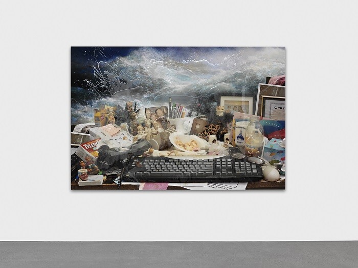 While kitsch and avant-garde are no longer meaningful terms with which to discuss contemporary art’s growing allure as popular entertainment for the many and lucrative asset base for the few, the show’s curatorial gambit to circumscribe the impact of conspicuous consumption and current junk culture on contemporary life is timely. To this end, Jon Rafman’s signature apocalyptic tableau of neo-Americana, You are Standing in an Open Field (Shipwreck) (2015), serves to illustrate the titular hint at a thunderous advent of some kind.2 The internet’s promise to promote infinite flows of information and connectivity is here envisioned as merely agglomerating into more detritus and stuff, only bearable with a dose of Tylenol.