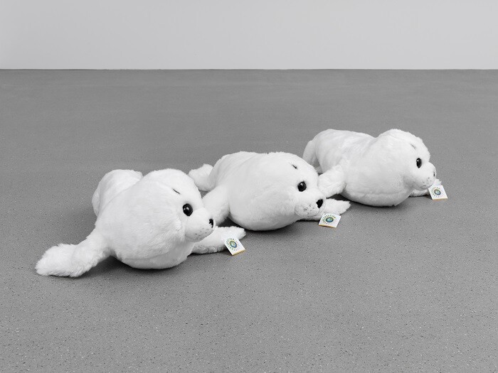 Ramaya Tegegne’s equal parts cuddly and disaffected triad of snow-white baby seals neatly placed on the floor (Ideas, 2015) puts a millennially eco-conscious as well as willfully vacuous spin on Mike Kelley’s famously loaded stuffed toys (such as his “Arenas” series from the late 1980s and early 1990s). The disquieting, albeit harmless, look and feel of many works in this show continues into the refurbished basement, where Denis Savary presents freestanding, child-sized silicone sculptures that look both fleshy and cold. Poetically titled Neige de Printemps [Springtime Snow] (2014) these creatures are supposed to evoke Inuit manikins but could also represent in vitro meat grown out of (creative) control.