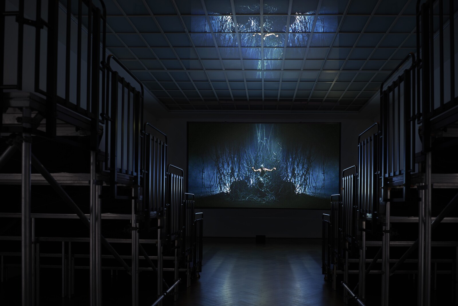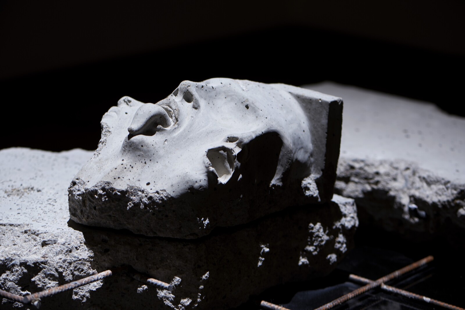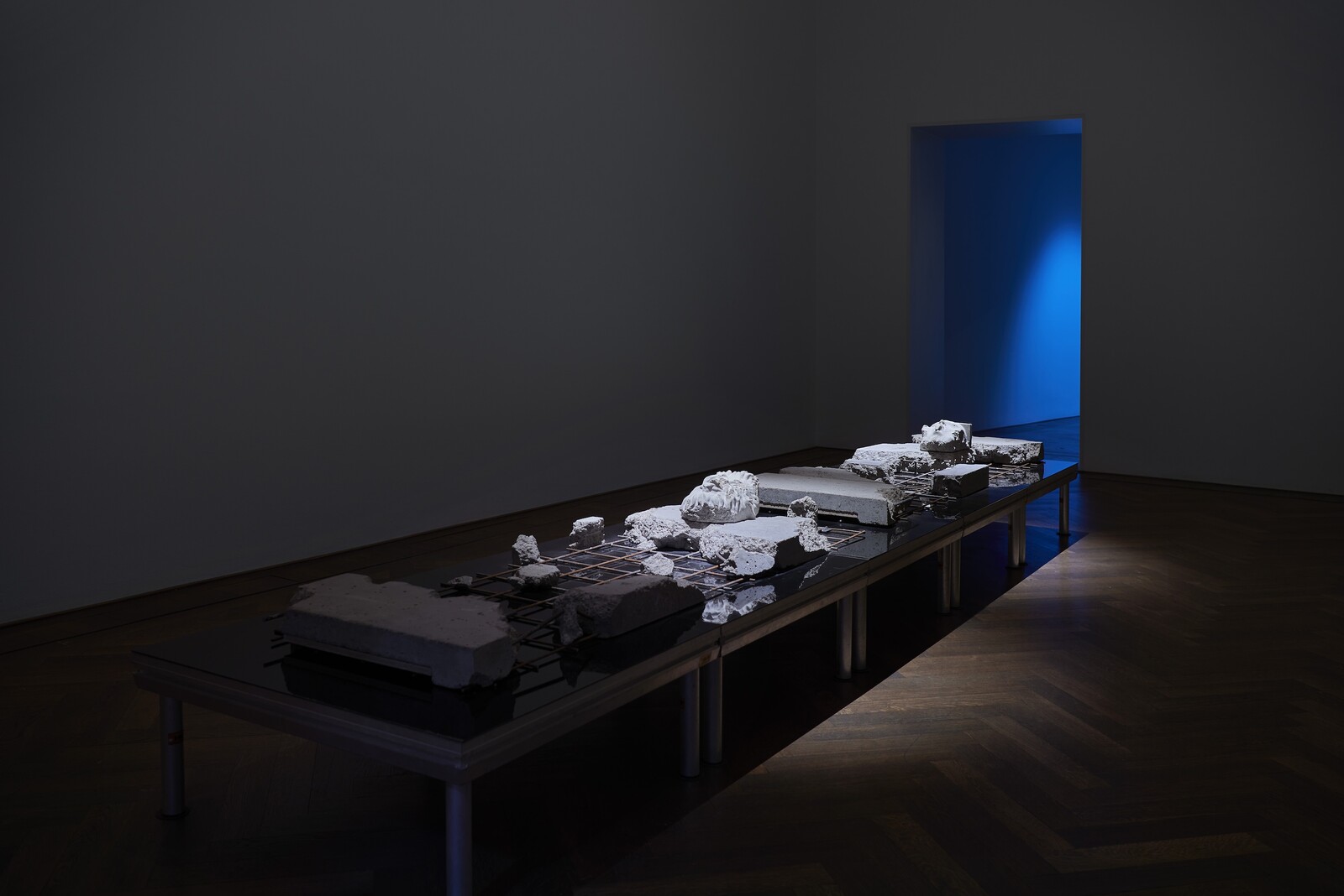 The entirely scripted To Exist Under Permanent Suspicion (2023), with its bassy soundtrack, turns up the volume on its predecessor’s thick sense of foreboding. Kayije Kagame plays an office worker driven to delirium by the degradations of corporate life—and, perhaps, vengeful forces rising up from the land beneath her workplace. Among Noujaïm’s preoccupations is how visions of “progress” predicated upon endless growth, emblematized by places like La Défense, are entwined with surveillance technologies: characters are constantly aware of being looked at and assessed. Building on Pacific Club’s exploration of the site’s prehistory, the district here emerges as a place where complex dynamics between watching and being watched, surveillant and surveilled, are negotiated, while monstrous forces manifest in surprising and violent ways. An installation of gargoyles placed atop a steel structure (Gargoyle 1 and 2, both 2024), positioned as a sculptural interlude between the first two screening rooms, lends pathos to the theme: gargoyles were believed to ward off evil spirits. Their fallen, broken stature here suggests both the loaded nature of “security” in our own surveillance culture and a disgraced emblem of the iconic architecture of Paris.