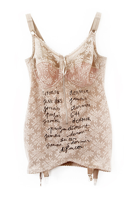 Dudu’s position is uncategorizable. She is an iconoclast whose vision is governed by irreverence and intuitive play. As a fashion stylist, she made corsets for Jean-Paul Gautier, and then started her own line of accessories using ancient beads. With Fabrice Lorrain, she won the prestigious ANDAM Fashion Award in 2001 for a series of performances in the late 1990s and early 2000s. Dudu and Lorrain’s innovation was to repurpose used clothing, amalgamating existing garments and shunning the fantasy of infinite newness. Together they made pieces for Lady Gaga, Björk, and Cat Power. In 2003, Vava founded La Chatte, French for pussy, a queer electro-rock-punk-pop band, for which she creates elaborate costumes like the one she wore for an interview at La Gaîté Lyrique in Paris when their album Crash Ocean was released in 2014. Her psychedelic stockings are reminiscent of Dr. Seuss’s early palette. These are topped by a giant, bright yellow puffer jacket. Two wilted plastic white women’s heads are spilling from the jacket’s collar on either side of Dudu’s own.1