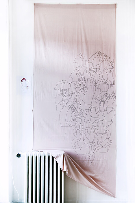 “Vertige Profonde” translates as intense or deep vertigo, but in the word profonde there is also the suggestion of some underlying phenomenon, as though vertigo were at the foundation of sexual play. The spinning, decentering center of human experience. As Dudu’s iconographic drawings spill down a rosé sheet pinned to the wall, its surface tension breaking only to accommodate a wrought-iron radiator, the myriad overlapping hands and faces figure the dizziness of the body caught in time with another body. The fact that the exhibition as a whole is still, nevertheless, results from the fact that there is nothing abject about desire as Dudu envisions it. There is violence, a lack of orientation and of any ultimate climax in her work, but it does not speak to what happens to the body before or after vertigo; there is no motive and no collapse.