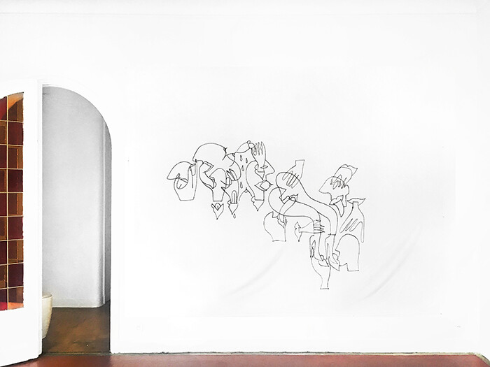 Vava Dudu’s “Vertige Profonde” at Marseille’s Salon du Salon is visually balanced to the point of stillness. The solo show occupies two adjoining rooms on the third floor of a spacious old bourgeois apartment on l’Avenue du Prado, a wide boulevard radiating out of the city center towards the south and into the city’s richer neighborhoods. Grids of pen-and-ink drawings on notebook paper and intertwining compositions scrawled across thin cotton sheets can do nothing—in the sense that desire is unstable and the drawings are about the movement of the body with another—to disturb the exhibition’s equilibrium.