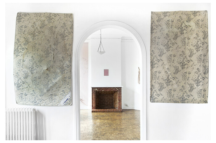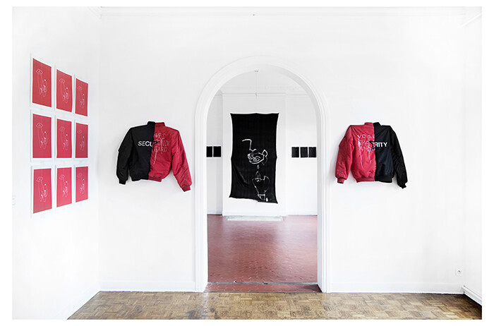 Two rooms separate two very distinct moods in Dudu’s work: one rosé and the other red and black. On either side of the arched doorway that separates these spaces, Dudu and Munda have hung a pair of jackets that are among the few works Dudu did not create in situ as part of her residency. A red jacket and a black jacket were halved and then sown together with the opposite half of its twin. The word “security” stitched into the back of the black jacket is thus split, as is the black star against a red ground on the other. Across both is stitched the phrase, “vous n’avez pas répondu à mon regard” (you did not respond to my gaze) but with the formal vous address. Dudu’s embroidered accusation is not addressed to a lover, in other words. I read the security jacket as the uniform of mercenary authority and the starred jacket as the representative of some mixture of punk and old-school communism, another kind of order, and only slightly less authoritarian than its twin.