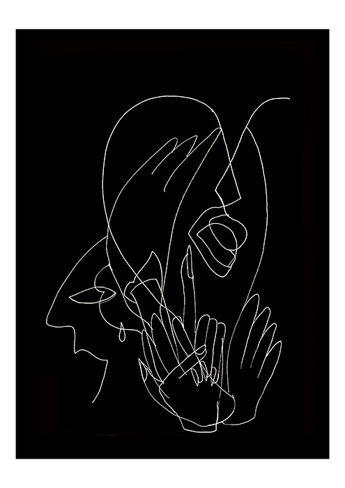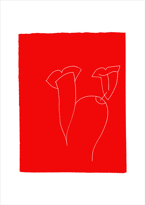 Small mounds stand out invitingly, sketched with slim lines, tucked inside abstract folds. Holes weep as the silhouettes of fingers slide into them. Disembodied breasts drip, lightly cupped by large hands. What kind of soft volume is that finger spreading beneath it, with its insistence on the vertical axis? “Does it matter?” Dudu’s drawings ask. There is nothing balanced about desire, and yet here it is, stilled, caught on rectangles of paper and cloth, so that one can focus on the implications of just that one mouth and the hand that is tangled around whatever it is sucking on.
