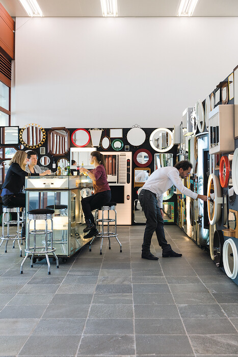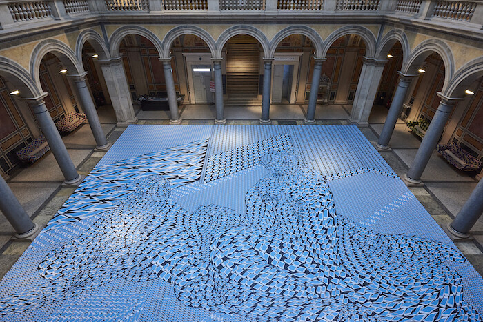 The 21er Haus exhibition was billed in the Viennese press as a weekend activity for children, which is fair enough considering the ping-pong, drawing, and cutting-and-pasting done in the space. More sophisticated exhibitions of participatory art explore the meaning of participation rather than simply offer it up, but as museums struggle for funding and recognition, these two institutions stand in solidarity to insist on the role of culture in society by staging an exhibition that exemplifies how viewers engage with it. It’s one answer to the question of what our public institutions do. Another answer is put forward by Thomas Bayrle’s solo exhibition at the MAK, the Austrian Museum of Applied Arts, for whose great columned hall he has created a new work, as well as an exhibit of works dating from the 1960s to 2017. Bayrle’s work in tapestry, prints, fashion and industrial design, photography, and sculpture corresponds to the pieces in the museum’s collection—furniture and applied arts, jewelry, posters from turn-of-the-century Vienna—in a way that sheds light on both. Tools, objects, pattern, and design raise questions that run along the history of making, and this exhibition looks to enhance the understanding of the institution’s collection and the contemporary work by bringing them together and linking them up.