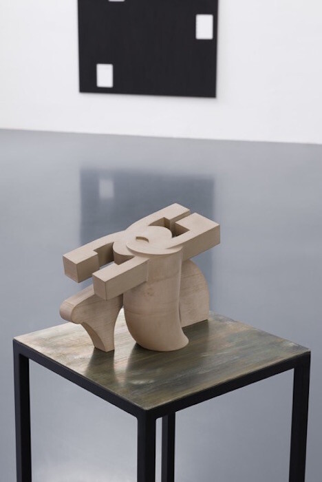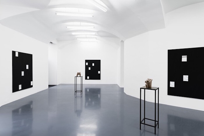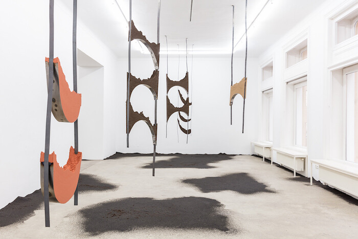 Two gallery exhibitions also consider art history, Andy Boot’s “Smart Sculptures” at Emmanuel Layr and Angelika Loderer’s “Quiet Fonts” at Sophie Tappeiner. Boot’s solo show includes two sets of works: paintings using “Black 2.0,” an acrylic paint promoted as the blackest black possible, to paint over texts theorizing two blockchain projects (White Papers, 2017) and 3D-printed sculptures made of an amalgamation of files. Resting on plinths, the sculptures look like modernist pieces (the press release mentions Barbara Hepworth) but where a modern master would sculpt by chiseling and carving from a material, Boot’s work is a process of addition. Down the street, Loderer is presenting sculptures made of metal and sand. Like arms, they hang from the ceiling above a floor covered with black sand. Entering the gallery is like moving into a grim and musty vision of the future—in which organic matter is foreign, distant, almost unrecognizable—but the work also brings to mind other sculptural examples and references, from Arte Povera to Miroslaw Balka.