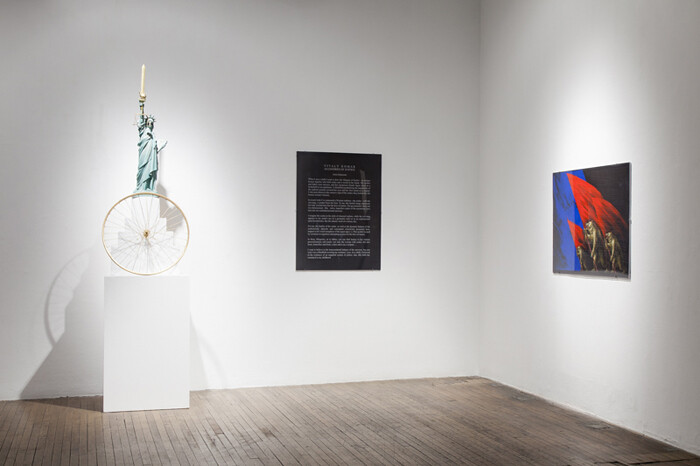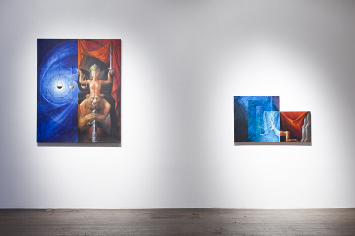 Komar’s recent exhibition at New York’s Ronald Feldman Fine Arts, “Allegories of Justice,” which includes a few earlier works by the former team, raises a number of questions. What happens when an artist duo splits up, as Komar & Melamid did? What happens when the context of any artist’s production—in this case conceptual sociopolitical work satirically skewering both Soviet ideology and American consumerism—vanishes into thin air, as the Soviet system did, leaving them and other Soviet artists without a framework? And how do they continue to make art in the context of the internal void of a suddenly collapsed culture? Also, in the case of Komar & Melamid—who left Moscow in 1977 and moved to New York the next year—how was their work affected by the external disruptions of emigration to a diametrically opposite society?