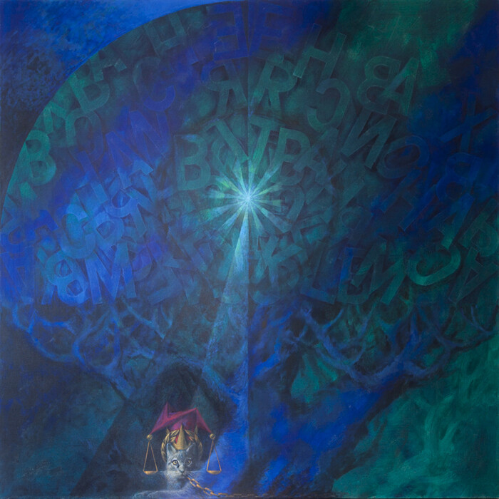 Among the symbolic replays and elaborations of scales, swords, and bears brandishing red flags in “Allegories of Justice” is one intriguing, atypical canvas: Pushkin’s Cat (2010–15). It pictures the expanse of an indigo-blue night sky with a central starburst and an indistinct whirlwind of green lettering. Down near the lower edge, an unsmiling cat on a chain peers out at the world. This wise cat is the storytelling narrator of a long epic poem by Alexander Pushkin, “Ruslan and Ludmilla,” a Russian classic dating from 1817. In the poem, the cat—bound by a golden chain “to a green oak by the sea”—walks slowly round and round the tree while retelling ancient Russian folktales and legends, and dreaming sadly of better days gone by. Pushkin’s Cat sums up the mood of Komar’s recent work. The familiar symbols and allegories seemed to have grown distant, generic, and nostalgic. Could it be that the artist, like Pushkin’s cat, is chained to his own painterly past?
