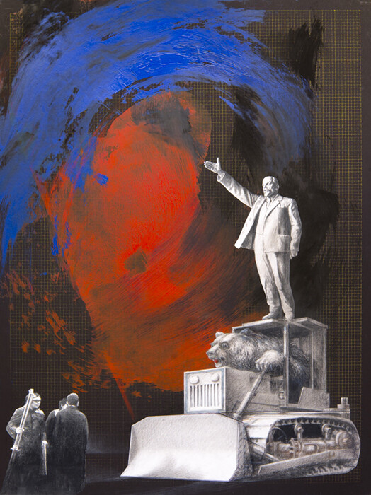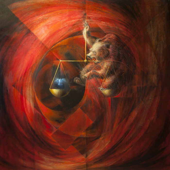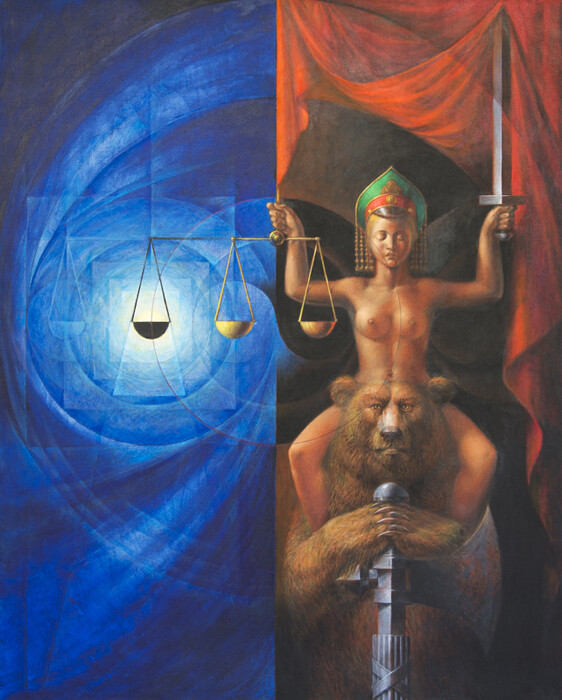 Vitaly Komar, formerly half of the illustrious team Komar & Melamid, which split in 2003, continues to paint in a style he has dubbed “New Symbolism.” For more than a decade, his virtuosic paintings of the proverbial scales of justice, tiny birds of truth, hulking Russian bears waving red flags, and circular serpents biting their own tails have been going through their allegorical paces, wrapping religion in history and spirituality in cosmic swirls. Melamid, meanwhile, has kept a lower profile.