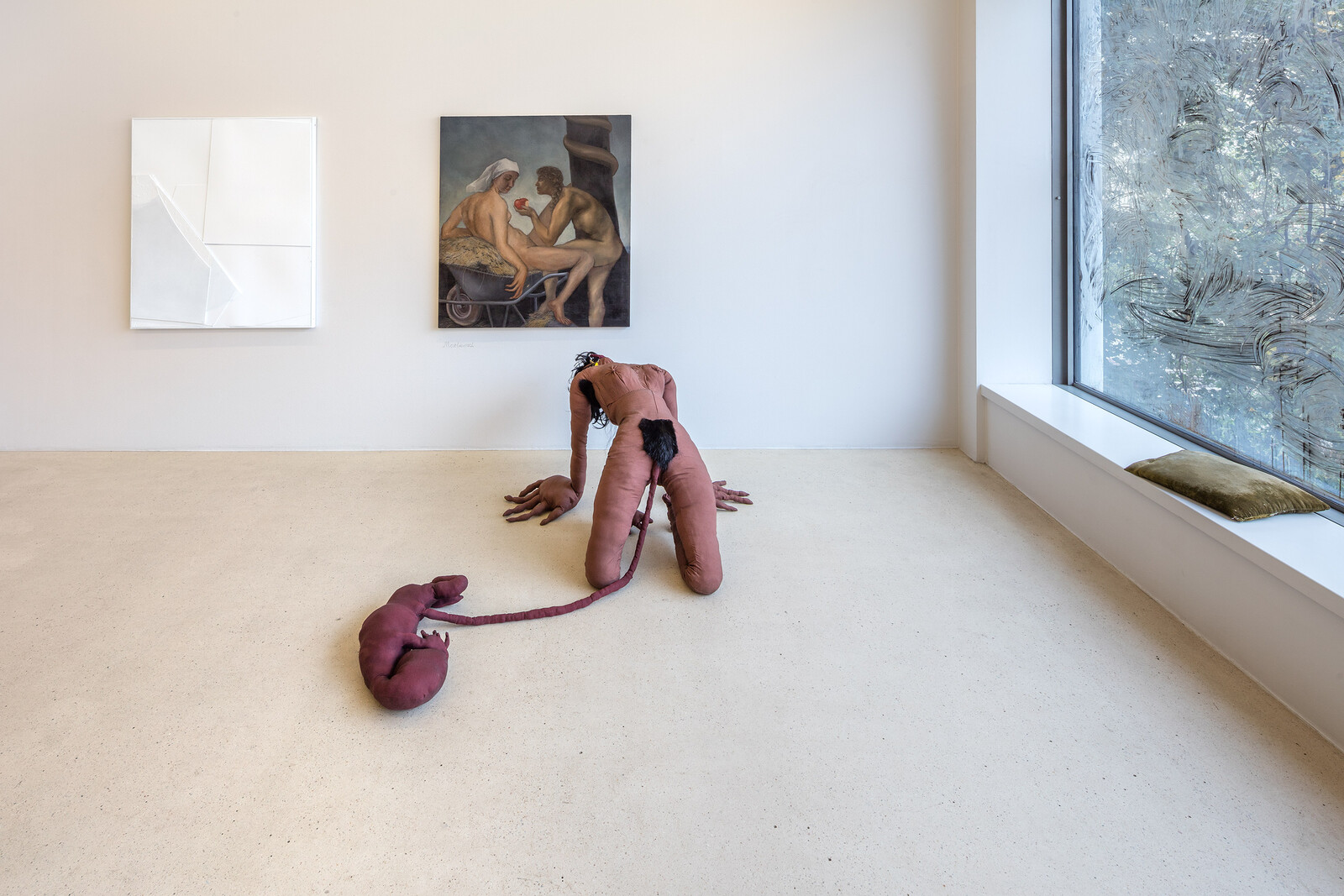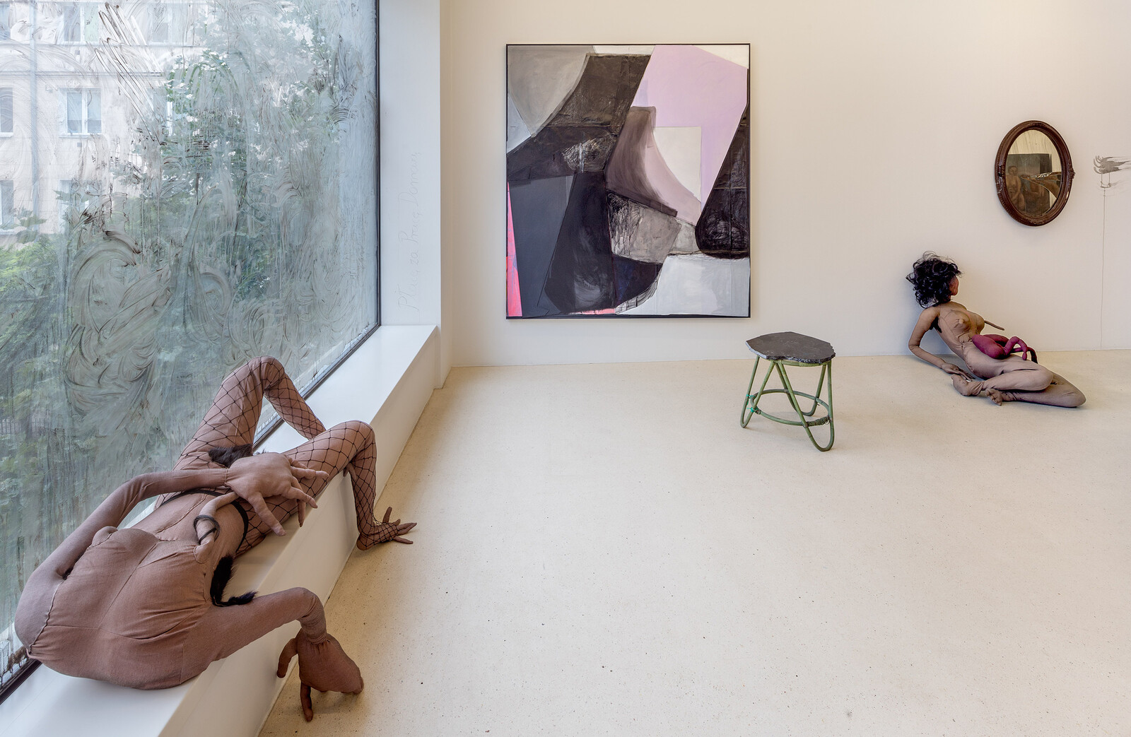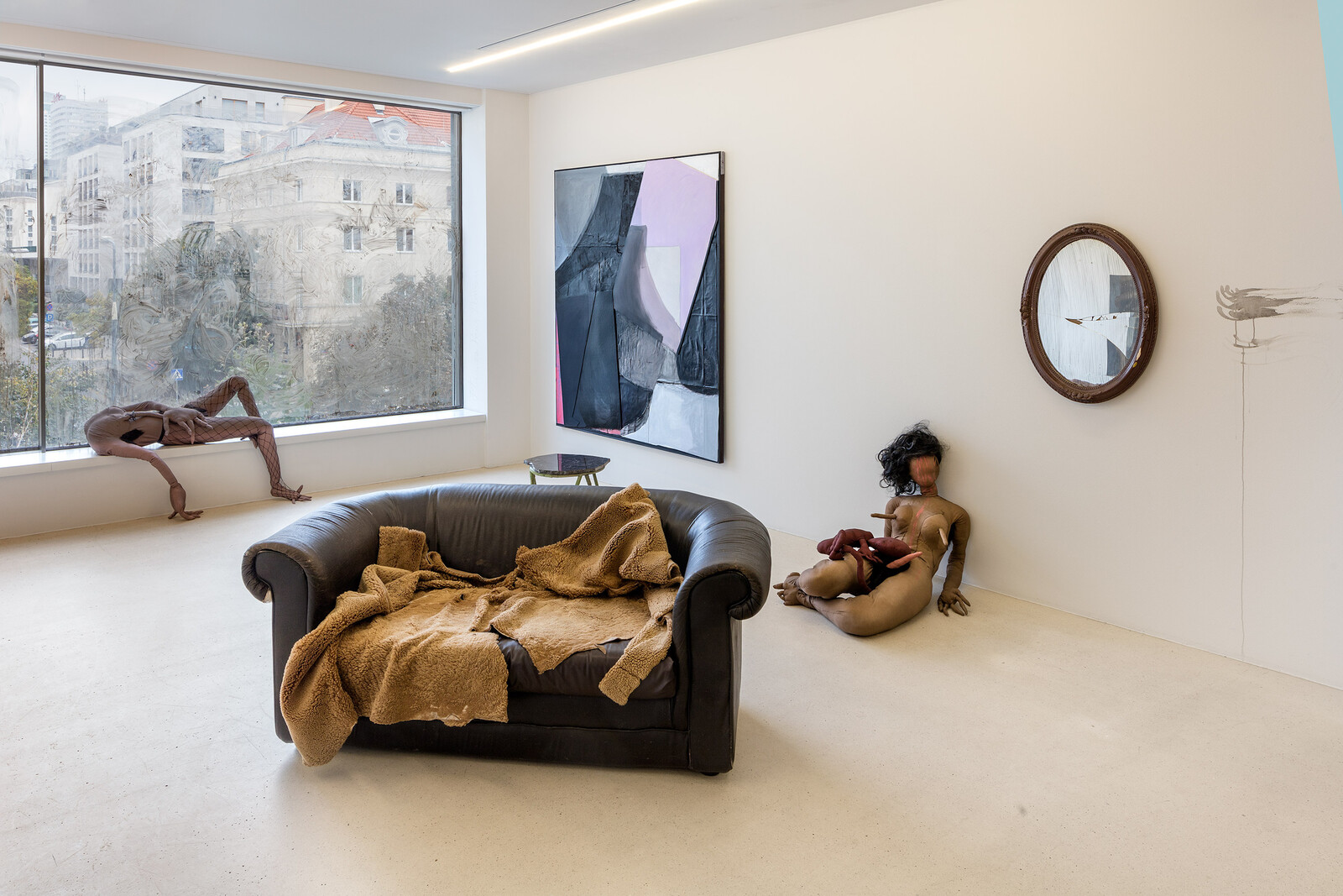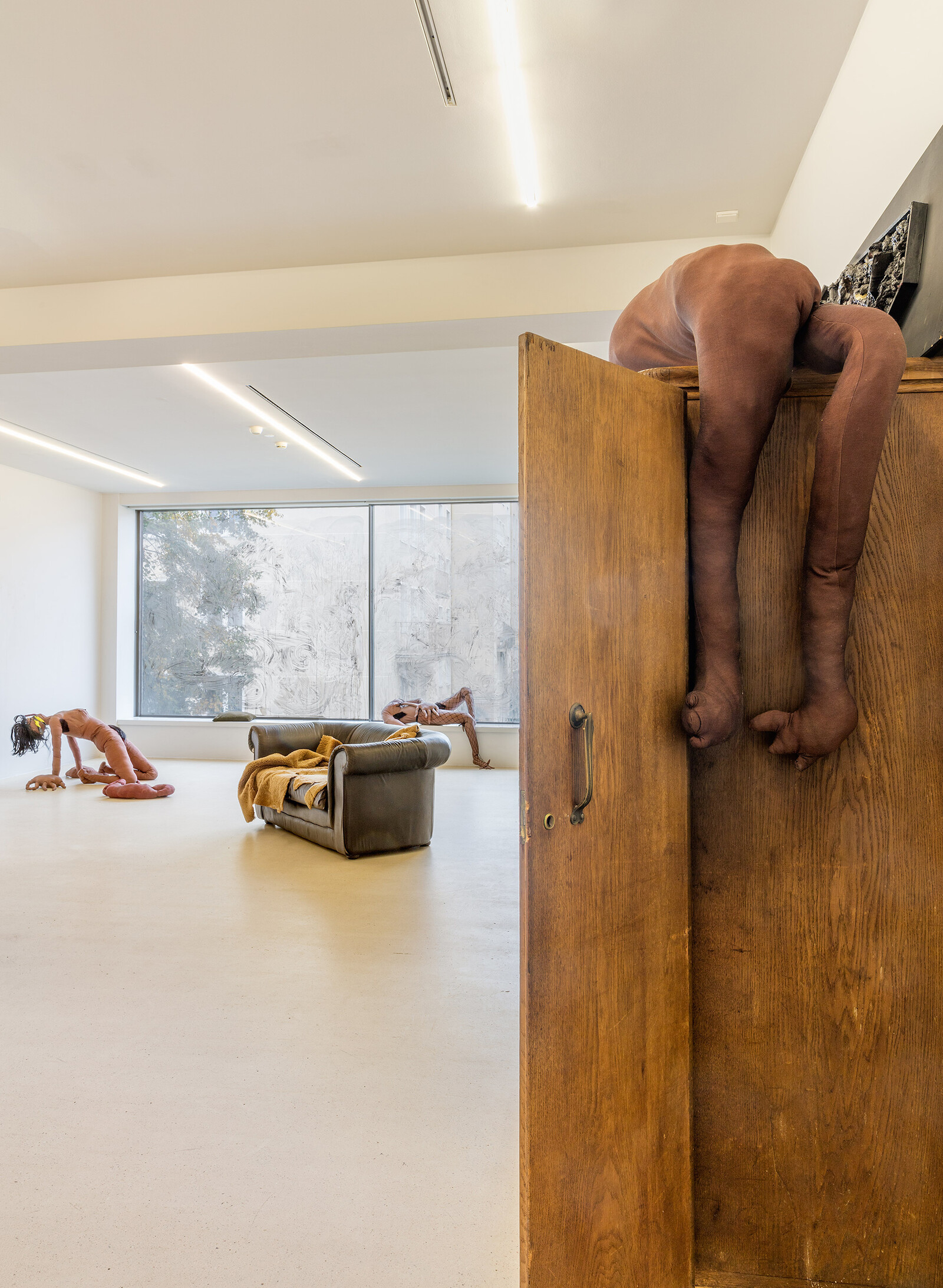 “Wages for Housework” borrows its title from the second-wave feminist movement, and specifically from Silvia Federici’s call for domestic work to be valued as labor. This influence is acknowledged in an ironic subversion of the very notion of housework: the large glass windows on the first floor of the gallery have been smeared by the three artists with a mixture of dark fluids. This level accommodates furniture from Słowak’s house, including a closet, a leather couch and a broken mirror: the gallery space, usually a sterile environment designed for untroubled contemplation, is transformed into an eerie home. With the artists’ intervention, visitors are forced to witness the muddy underbelly of the modernist narrative.