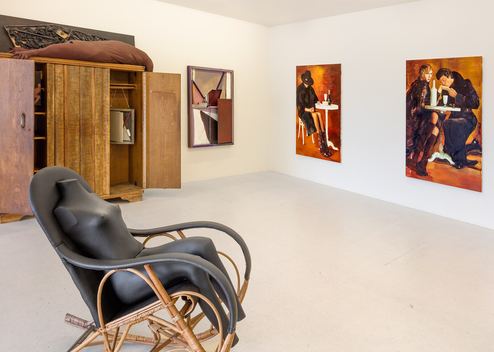 The exhibition overspills its boundaries: it is sometimes difficult to determine where scenography ends and where an artwork starts. This is the case with Załuska’s small abstract composition, resembling a winged retable, hidden in the half-open wooden closet. Two of her larger pieces (also both untitled) dominate the lighter, less crowded space on the upper floor. The two-sided abstract constructions, of varying thickness, material (cardboard and wood) and color (plum, ochre, and gray) don’t shy away from exposing their irregular undersides: they resemble constructions in process, shapes frozen mid-form.