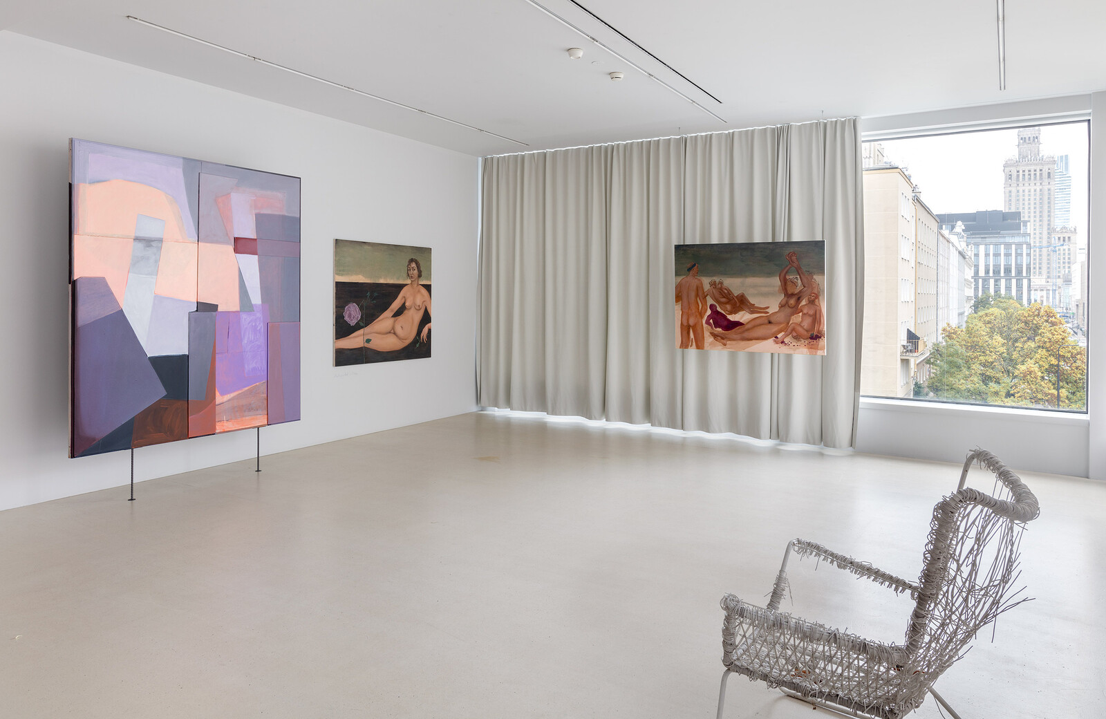 The show builds on Ołowska’s longstanding interest in complicating the male history of modernism; her previous work has involved research on artistic personas (including Zofia Stryjeńska, Janina Kraupe-Świderska, and Maja Berezowska) and engaged with media and visual idioms that blend “high” and “low” culture. More recently, she has turned towards an investigation of “the grotesque” as formulated by Mikhail Bakhtin: its main principle of corruption as a means of subverting the dominant discourse is apparent in works focused on points of breakthrough, crisis, and change.