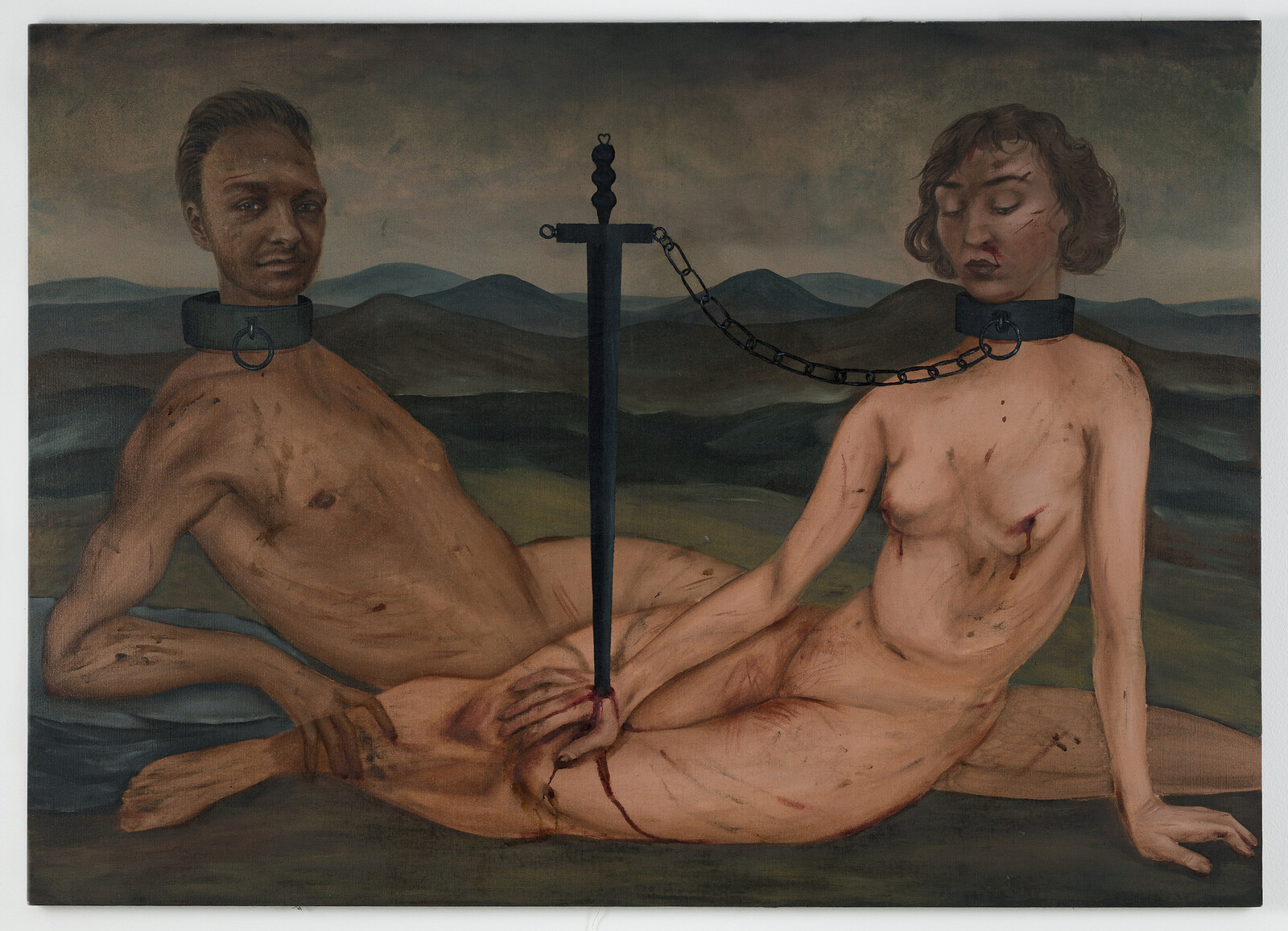 “The grotesque,” notes the writer Tess Thackara, “is inherently associated with the feminine, long having shaped depictions of the female body—prostitutes, femmes fatales, and sorceresses.”1 These transgressive figures populate the first part of the show. Słowak’s painting The Sacrificial Rabbit (all works 2020) depicts three female personages with the animal offering hanging in the background. The trio, engaged in a sensual exchange of gestures and gazes, seems to embody the coming of a new order: one that is intransigent, violent, and mounts a challenge to the status quo. The promise of revolt also lies at the center of Słowak’s Opportunities. In an uncanny paraphrase of the biblical scene, a woman on a hay-filled wheelbarrow is offered an already bitten apple by a woman-snake hybrid. Ołowska’s monumental Alcoholic, Lover, and Seducer portray the limited set of roles that a “liberated” woman can be expected to assume: the protagonists’ characteristic traits, as if composed according to past iconographical conventions of portraiture, are specified through attributes—perfume, pearls, flowers, bottles. Yet Ołowska’s majestic femmes fatales are in no way regretful, disappointed, desperate: they seem oblivious to the parts that they were supposed to play, resistant to the stereotypes intended to categorize them.