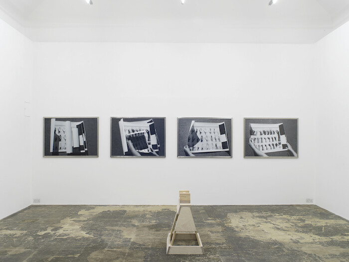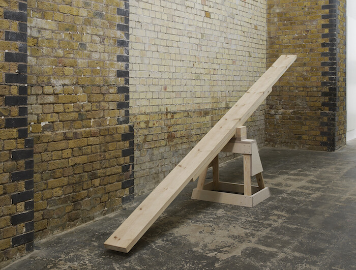 Forti’s See Saw (1960) is an integral art-historical, thematic, and aesthetic reference point in “When my eyes saw and when my ears heard,” a group show at Hollybush Gardens that explores how bodies work within, and against, given rules (gravity being just one). In collaboration with Forti, Stockholm-based artist Luca Frei has directed a new iteration of the piece (Simone Forti’s See-Saw, 2017), performances of which bookend the exhibition. Frei’s version is faithful to the original work, in which a man and a woman sit, walk, dance, and crawl across a plank as it tilts on its fulcrum, but introduces a second saw horse and extends the performance across the width of the gallery rather than confining it to the central prop. In Forti’s words, “the slightest change of position by either performer, affects the balance of the entire setup.”2