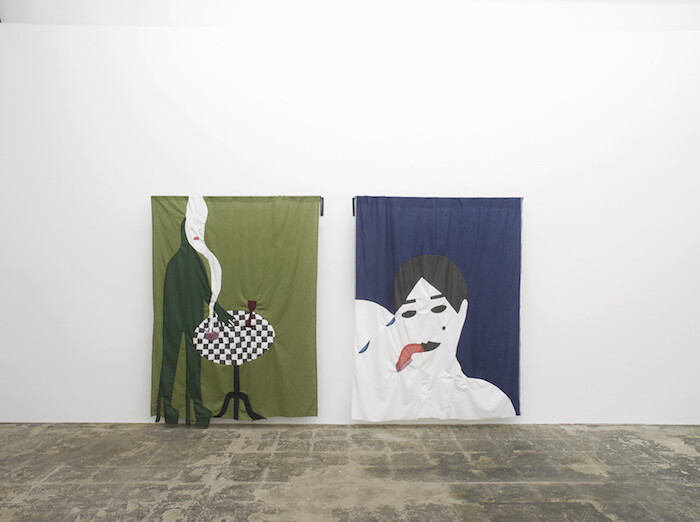 Two Adam Christensen fabric works (both 2017) hang from wall-mounted steel railings in the main room. Smoke in My Eye shows a tall, cartoonish figure in high heels standing beside a table, staring out, in glum resignation, as cigarette smoke flows upwards in a riverine cloud and across their face. A Blank Stare depicts an ambiguous embrace: a woman stares the viewer, her closed lips tongued (forcibly or amorously, it’s hard to tell) by a bald companion. Christensen’s pieces offer textural contrast to the hard surfaces seen elsewhere in the show. Blow on the fabric, and it ripples lightly. Lean behind it, and you can see the knotty tangles of fine threads of the reverse side. The exposed, delicate construction emphasizes the diaristic intimacy of the scenes—an intimacy that carries through to Christensen’s performances, which combine readings of confessional texts with music. These fabric works remind us that domestic spaces can also be theatrical ones: places in which we perform. Manon de Boer’s 16mm film An Experiment in Leisure (2016) features various artists reflecting on the work of psychoanalyst Marion Milner. This languorous, overtly meditative film lacks the arresting quality of the other works on display, yet the thematic parallels are clear enough: “So we actually rehearse in the sense of repetition,” one subtitle reads, “repeating the text over and over.”