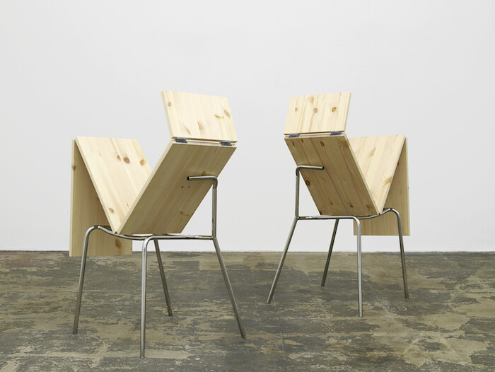 In her recent book on Simone Forti, Meredith Morse argues that Forti’s practice has “one foot inside art history’s frameworks and the other outside it.”3 The same might be said of Charlotte Prodger, whose “Sophie With Sheets” (2009-2016) provides a series of fairly literal art-historical frameworks. These four black-and-white photographs show a woman’s hands unfurling sheets, each page printed with sequential, Muybridge-esque photographs of hands bunched into fists, open-palmed, and so on. Delving into the archive is itself depicted as a series of actions, movements through which the past is re-framed. Directly opposite is a pair of sculptures by Frei (Idle, 2017). The works comprise tubular steel chair bases that support hinged and folded pine boards, rudimentary wooden structures resembling uncomfortably seated figures. Though inspired by the playful fluidity of See-Saw, Idle expresses physical restraint and restriction, even sadistic forms of punishment.