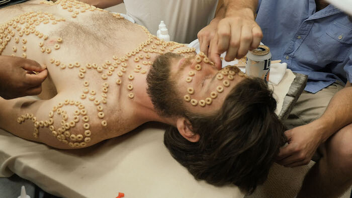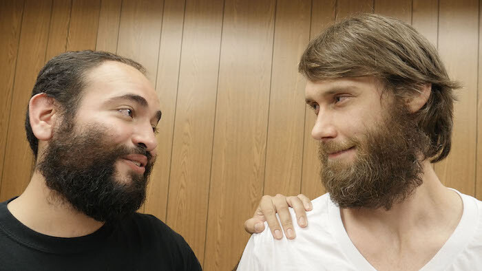 Precarity and social interdependence feature in Kenneth Tam’s Breakfast in Bed (2016), which makes for uncomfortable, if frequently amusing, viewing. The half-hour-long video documents a series of activities performed by a group of men in a wood-paneled room, roughly the size of a shipping container. The claustrophobic environment intensifies the awkwardness of this male bonding session, as bearded dudes partake in activities common to children’s parties (playing tag, dancing in a circle) and swap insights into one another’s physical appearance. The men appear to be enjoying themselves. They are relaxed and expressive. And yet there is no release from their purgatorial intimacy, emphasized by the fact that the film runs on a loop. Is Breakfast in Bed a comment on patriarchy (oppressive, inescapable)? Or does it offer a laboratory in which to dismantle the male psyche, encouraging men to unlearn repressive behaviors? The meaning is ambiguous. Perhaps it’s just a game.