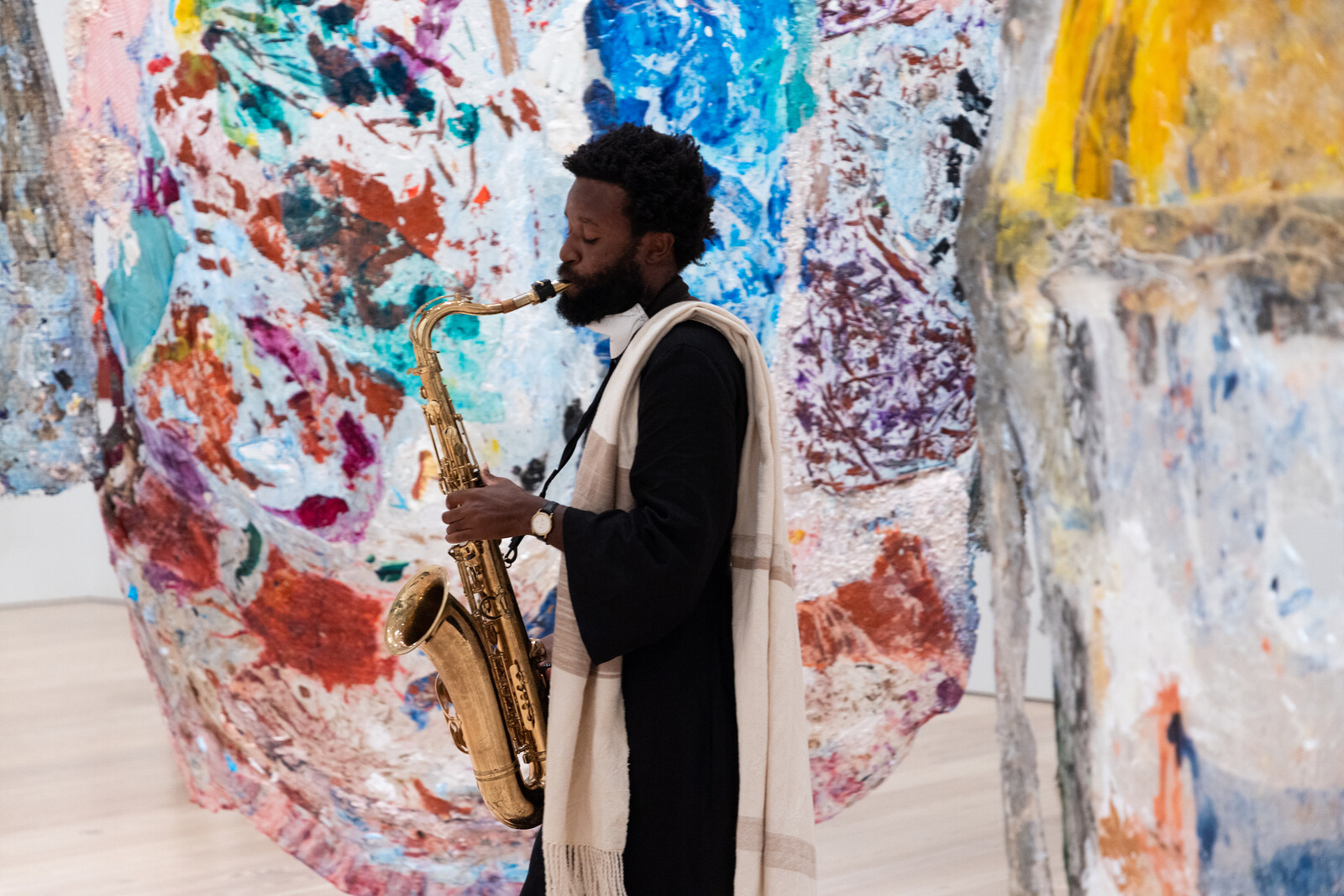 The outstanding work of the series was the closing performance by JJJJJerome Ellis, in which he guided a small audience on an intimate and idiosyncratic tour of the biennial.1 Ellis read the wall texts aloud, and shared thank-you letters that he has written to each artist, expressing his gratitude for the insights their work had provided him. He walked us through works by Holland Andrews, Ser Serpas, Suzanne Jackson, K.R.M. Mooney, B. Ingrid Olson and ektor garcia, interacting with them through his saxophone, synthesizer, hammered dulcimer, singing, and occasionally dancing. Elllis reflected on the precision and care that went into ektor garcia’s hanging sculptures of crochet copper-wire, reminding him of the way his grandmother used to sew clothes. Striking and plucking the strings of the hammered dulcimer, not always in tune, Ellis sang an intimate song to us that he used to sing to his grandmother. The performance-tour was genuine, enticing, playful and even absurd at times. By intertwining his own sound and movement with the pre-existing works, Ellis introduces a novel perspective that challenges, and extends, what the original artist, as well as the biennial curators, intended.