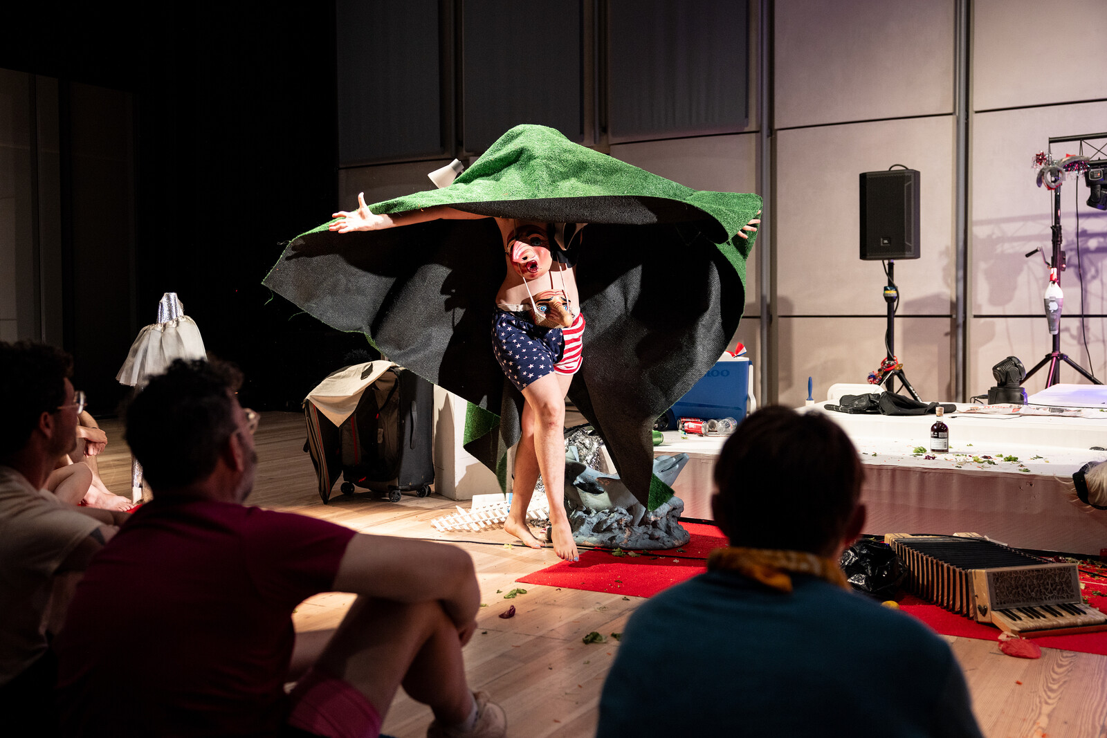 Another work that engaged with identity-based questions was Alex Tatarsky’s performance, though rather than addressing a broader societal issue, Tatarsky offered a manic, introspective exploration. While Tatarsky was accompanied by a musician, their piece stood out from the rest by its focus on the body as a performance vehicle. Dressed up as a clown, Tatarsky presented what they described as a “stand-up comedy” coming from a “place of rage,” invoking the frustration of sitting through bad comedy. They accomplished their goals pretty quickly, with half of the audience appearing visibly irritated and confused, while others were really engaged, particularly during their crowd work, which involved clapping, props, and banter. Their exhibitionist and hedonistic sexuality was a central theme, interwoven with references to Catholicism, childhood, and dom/sub-culture. Perhaps the performance was chosen by Cheek as a nod to the curator’s brief association with the art amusement park Luna Luna and the recent rise of clown-culture in New York, including the Clown Cult show in Brooklyn which gathers dozens of clowns twice a month. Yet this particular show felt disconnected from the program at large due to its navel-gazing nature.