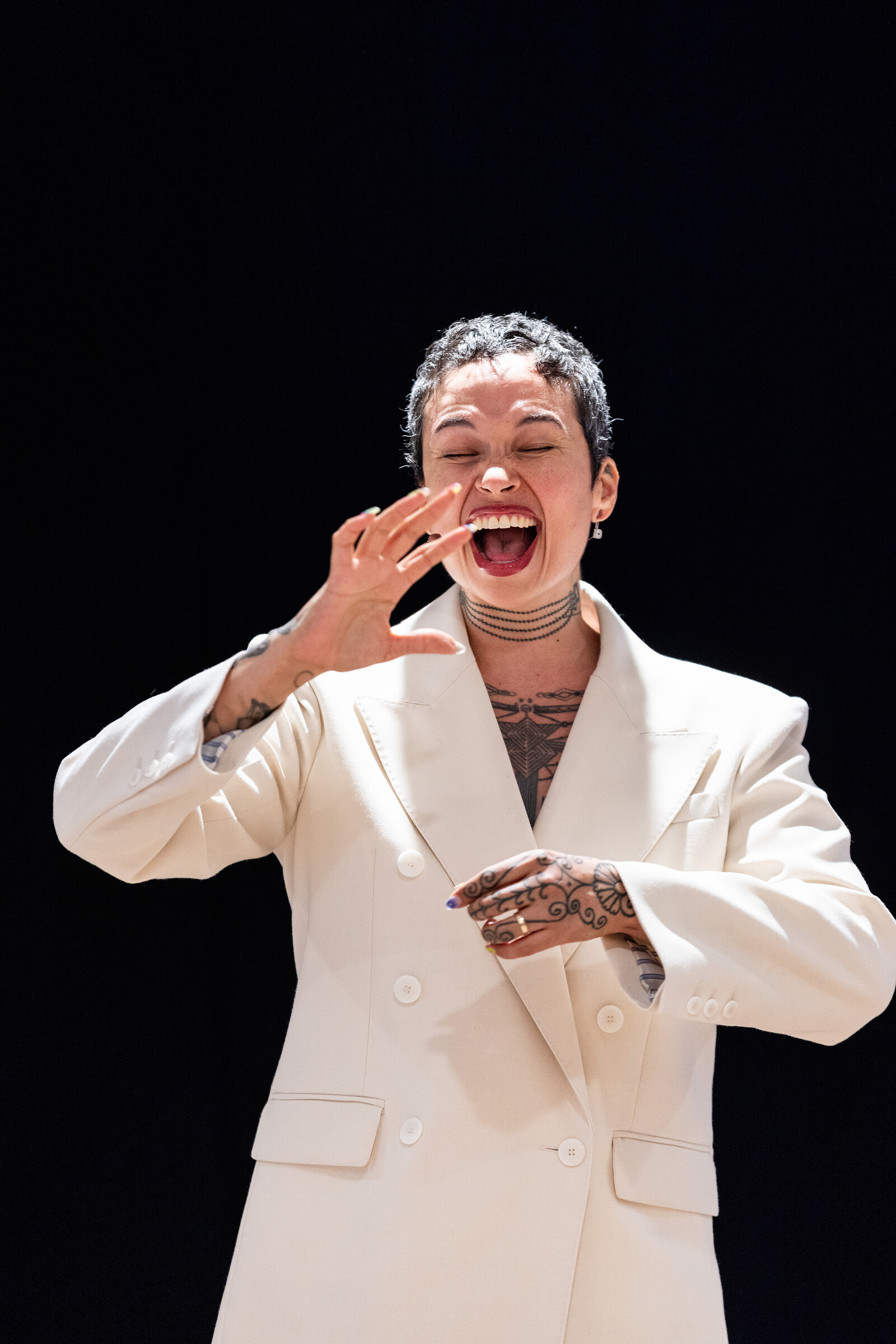 The program began with Debit, playing music from her album The Long Count (2022), which imagines the music of the Mayan civilization through a theatrical and fantastical three-act performance, using intense drone sounds and samples of precious and eerie wind instrumentation. The stage consisted of a mountain made out of a pile of dirt/wood, spot lights and a curtain that was lifted at the end of the show to unveil the Whitney’s majestic view of the Hudson River, alluding perhaps to a call for the land. Debit used synthesizers which, according to the press release, “have sampled and processed the sounds of Late Postclassic Maya wind instruments. Using tones from an ancient culture and of-the-moment technologies, the performance shuttles the distant past into our contemporary artistic universe.” This use of machine-learning is in line with Holly Herndon and Mat Dryhurst’s program Spawning, to which you can feed your own voice as training data, and it can sing it back to you. Herndon and Dryhurst are represented in the central exhibition of the biennial (in the form of several images from their AI project xhairymutantx, 2024) but were not included in the performance program.