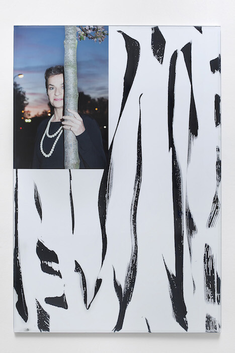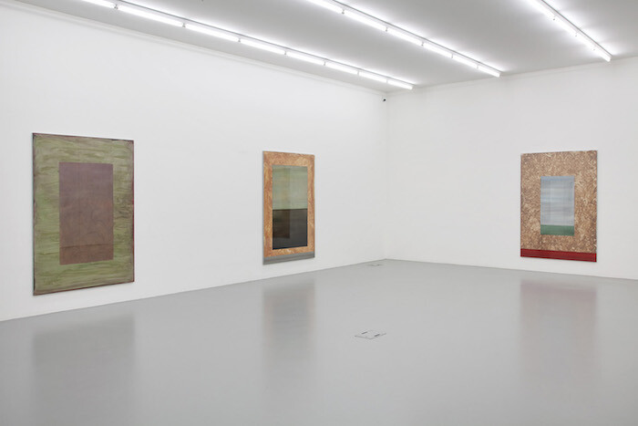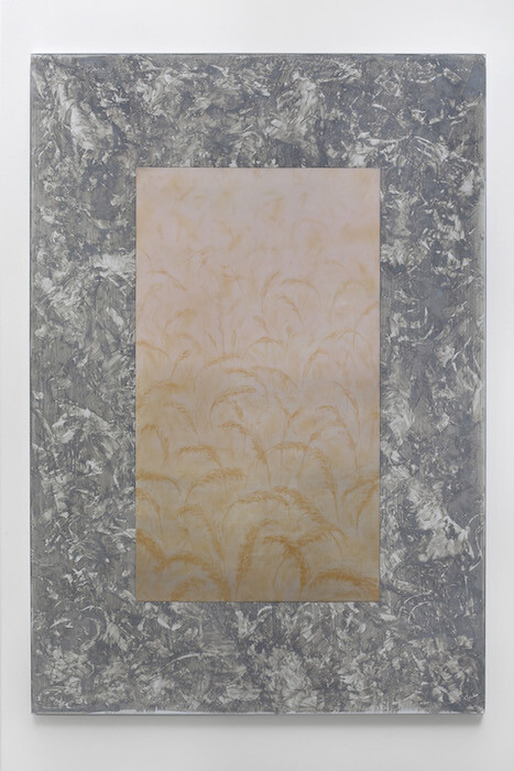 The technique, which is typical for the artist, is based on layering and multiplication: Benedict paints with fluid brushstrokes on canvases that he cuts out and neatly inserts in painted foamcore panels. He then encloses each work in a reflective glass, aluminum, and transparent tape frame, so that the viewer’s image is systematically integrated in the piece. As with Dan Graham’s two-way mirror surfaces, audiences see themselves seeing, and are asked to reflect upon what they are looking at. By playing with trompe l’oeil, sprezzatura, and visual ambiguity, Benedict points to complexity. Here, with an elegant palette of sage green, gray, beige, lavender, mauve, organic brown, and maroon shades, halfway between Pompeian Third Style, Japanese zen screens, and post-Rothko sublime, he also brings to mind the fading bon ton and role of the cultured elite and “representative bodies” in running a democracy.