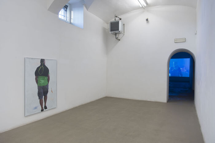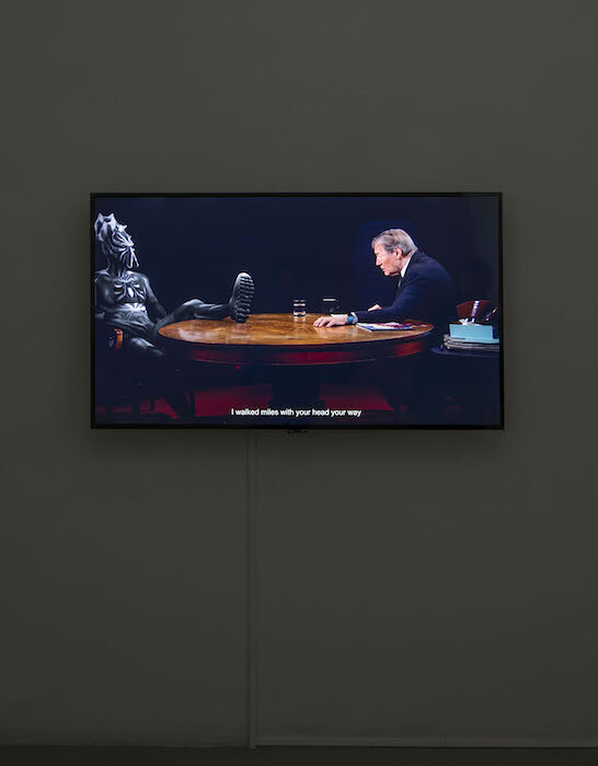 There is only one video on show: I AM A PROBLEM (T.O.D.D.) (2016), screened on a monitor in a side room, with headphones filtering the thunderous soundtrack by Detroit-based noise band Wolf Eyes. Premiered at the 9th Berlin Biennale in June of last year, it shows an alien with a black-and-white mask-like face, black leather pants, and platform boots, interviewed by TV anchorman Charlie Rose, on the subject of immigration—the quintessentially dehumanized Other. How timely.