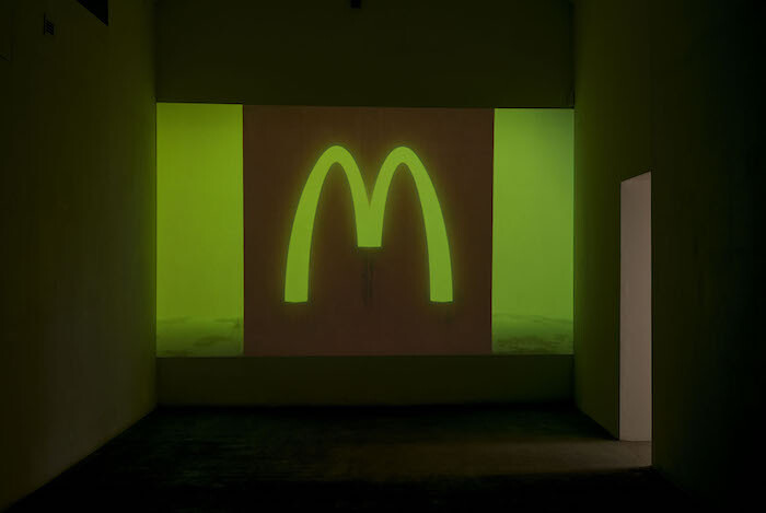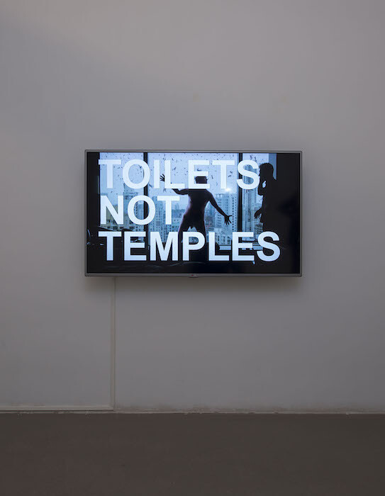 Feeds and food are recursive subjects in the artist’s videos, which prevail in the Rome exhibition. The Bed That Eats (2015) is an animated “still life,” where bottles and plates rest on an unmade bed, which opens its mattress/mouth to sing as well to swallow. Inside its guts, one discovers McDonald’s yellow arches glowing in the dark. In the mockumentary Toilets Not Temples (2014, made with L.A. journalist David Leonard), which opens with naked bodies falling from the skies, like a biblical plague, Benedict mixes together info on climate change, vineyards, and food crises in India, and a dolphin-headed lady discussing fishing and shopping in Norway. “The idea of consumption and consumerism, how we ‘eat’ images, is deeply embedded in art,” Benedict says in an interview with Martin Clark.2 And in the spectacularized politics of the contemporary—less and less social—democracies, I would say. How toxic.