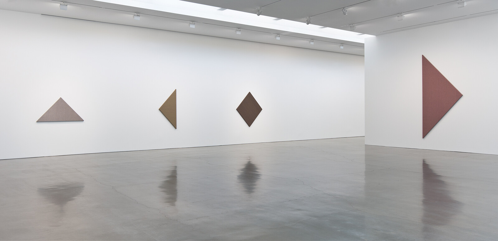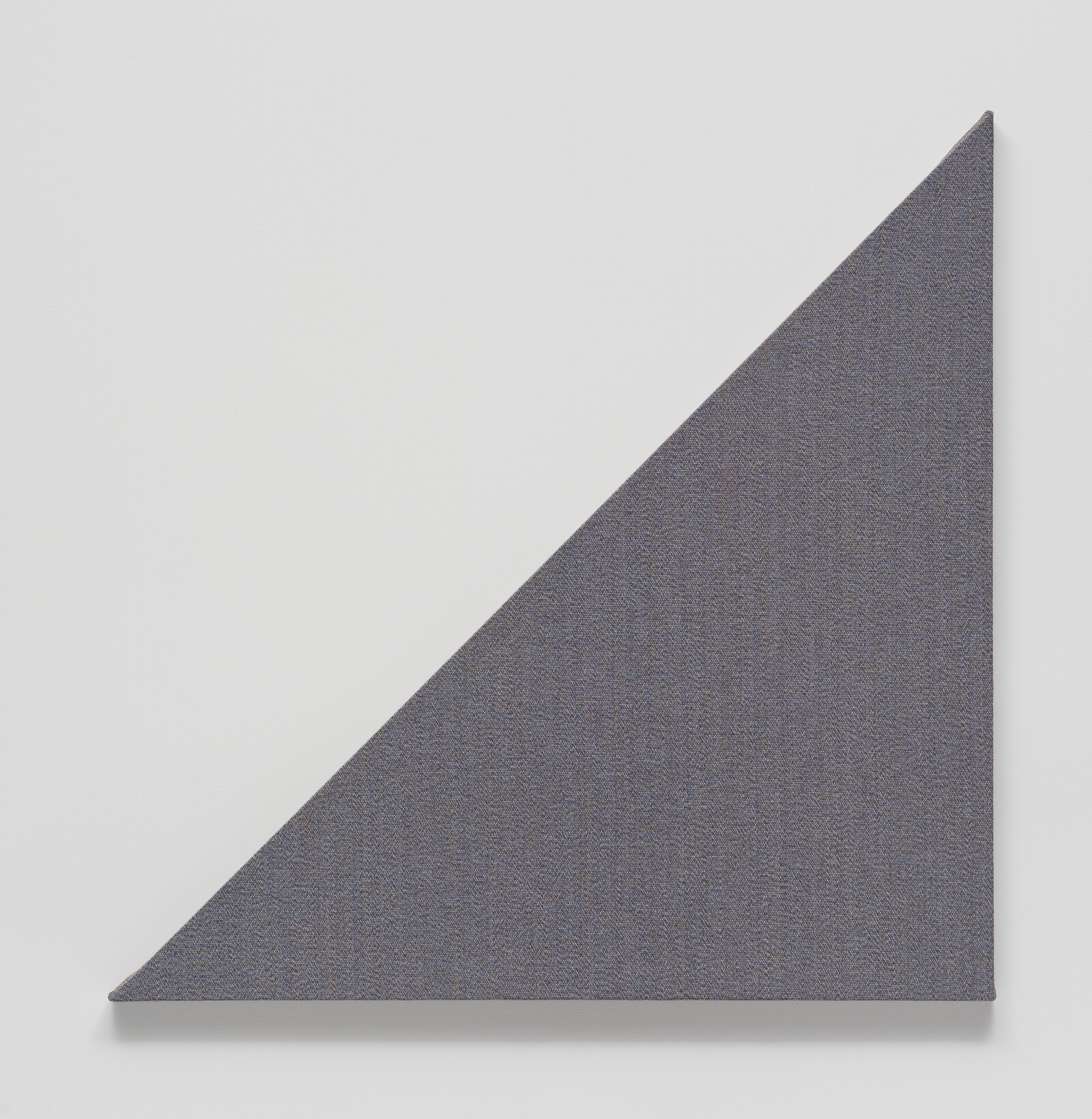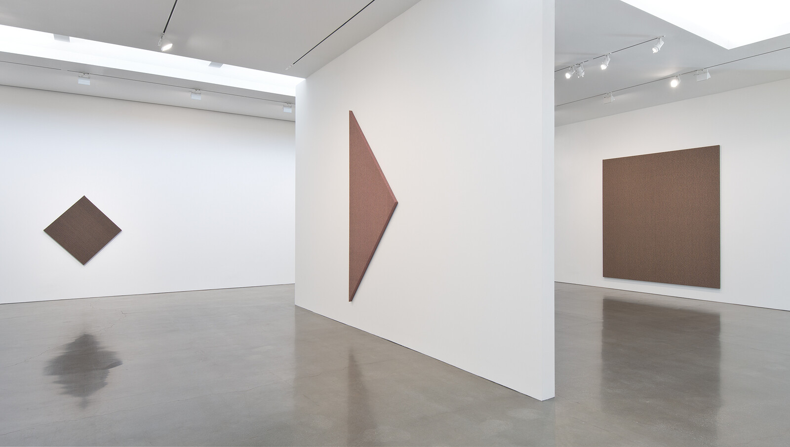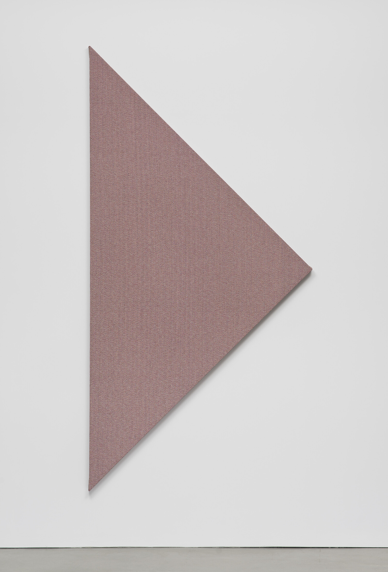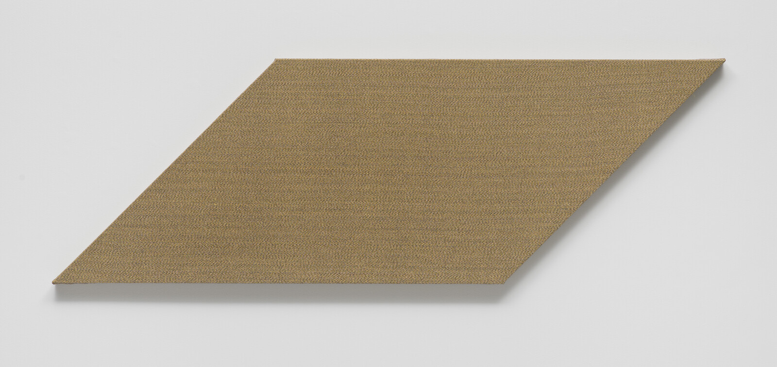The seven wall works in Willem de Rooij’s new exhibition are each one part of a tangram, a simple Chinese puzzle in which this family of shapes come together to form a rectangle, or one of 6,500 other possible outcomes. First marketed in Germany in the late nineteenth century, they were often carved from stones or imitation earthenware, similar to the color scheme here. Each piece, or tan, is a shape of stretched fabric enlarged to several feet high and wide, spaced generously, and woven from threads dyed the seven colors most prevalent in de Rooij’s oeuvre: black, blue, brown, gold, pink, silver, and yellow, combined in varying concentrations, lending a slightly different shade of brown to each of these works when observed from a distance (Rosa, Dreieck; Gelb, Parallelogram; Schwarz, Quadrat, and so on; all works 2015) while an additional two rectangles (both gemischt groß) are colored by an even distribution of differently pigmented thread in each weaving, leading to two pieces mirroring the exact same muddy brown to each other. An intimate glance at any of them discloses the vibrant prism of each weft, but it has to be so close as to almost softly crush them.