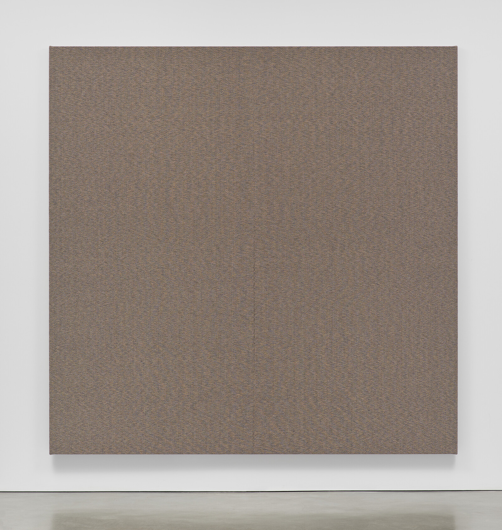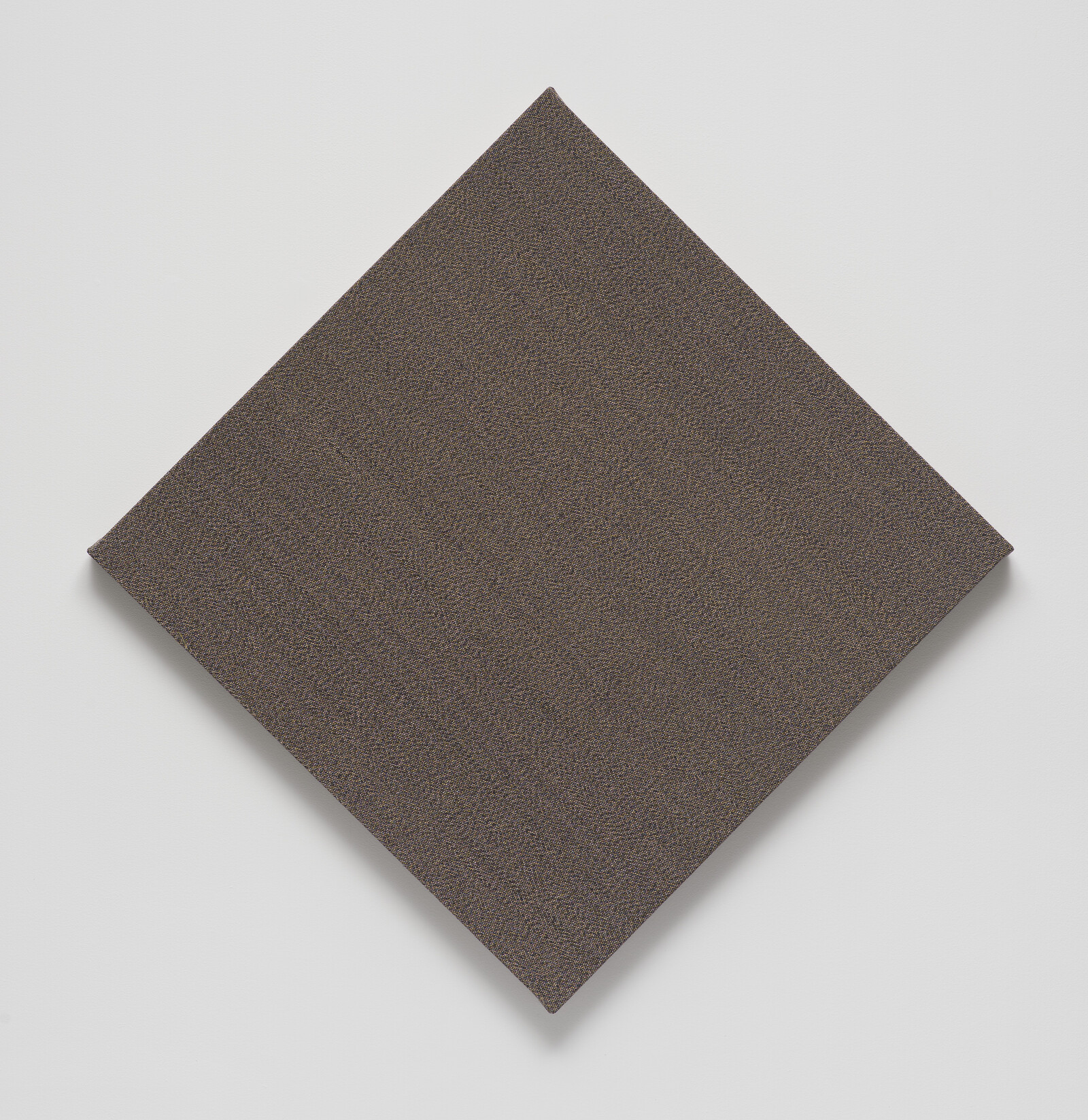 The fabrics were made, like all of de Rooij’s weavings, with Ulla Schünemann in a factory near Potsdam on nearly 300-year-old looms. Starting from the spectrum of Silver to Gold in 2009/2011, they’re now a shimmering bronze. The product they’ve collaborated to make is something like sandpaper—undulating shades of sepia, all texture, no edges. The warm radiance of such simple, flat forms must be borrowed from the Netherlands’ Golden Age of painting by the Dutch, Berlin-based artist, as a disseminated seventeenth-century glaze softens these severe objects. Continuing to practice such historical production, and with such deliberation, elevates the fabric from Minimal materiality to a surface for anthropological representation.