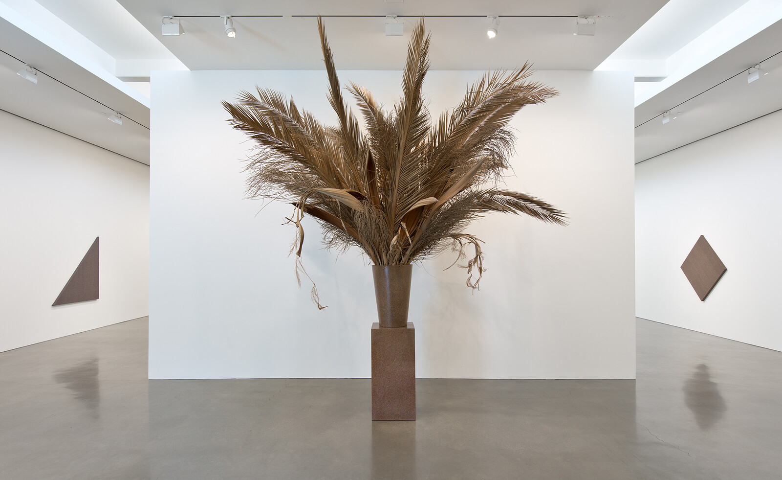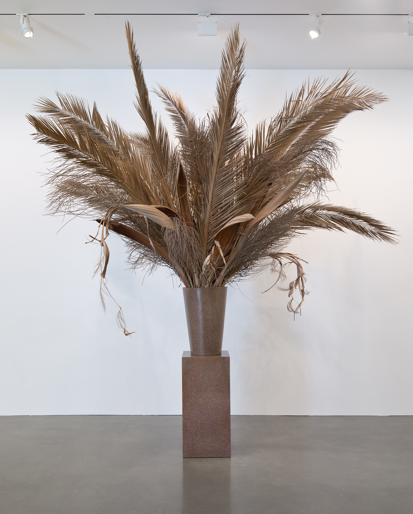 The installation is spined by a sweeping taupe arrangement, intimidating in posture, heartbreaking in its tactile frailty. Bouquet XVI, the city’s memento mori flora offering, made in collaboration with florist Joseph Free, is a grand, ornate corsage almost reaching the ceiling, colored like a sandcastle, and, like many of his “Bouquets,” shows very little color contrast between its ochres and chestnuts in person, virtually none in photographs. XVI is composed of whole preserved local palm-tree fronds and wispy, long-stemmed flowers, each one brittle to the touch. All were sourced from the sidewalks of the Hollywood blocks surrounding the gallery, completely dried out from the relentless California drought and roughly shed, here rustled lovingly like crushed plumes on a dying sparrow. Giving this welcoming piece some weight is a substantial opaque vase balancing on top of a matching plinth, two pieces resembling marble from a distance, but are actually disguised ceramic and wood constructions, speckled with layers of sienna shades of car lacquer to resemble a synthetic, plastic material slickly veneered in true West Coast finish-fetish style.