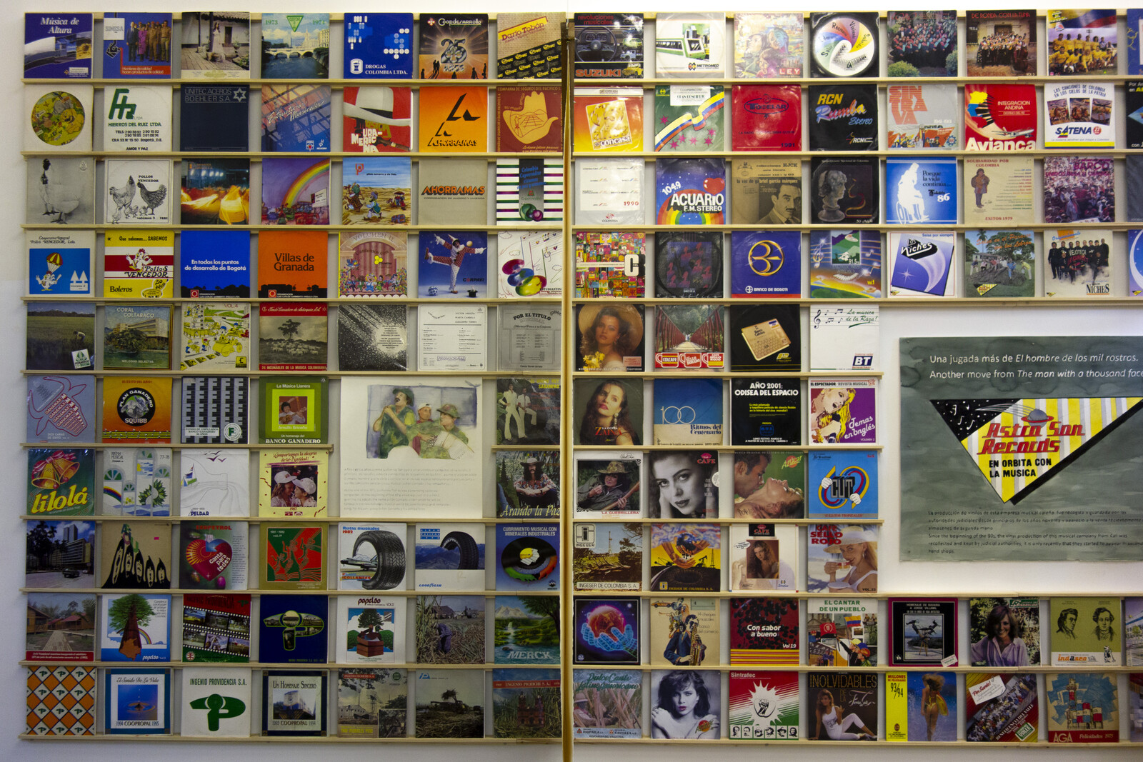 A grid of over 150 LPs lines one wall. Díaz has been accumulating this collection, entitled Amarillismo [Sensationalism], since 2008. It includes a range of records including La Guerrila…y cambio su traje de encajes por la vieja carabina [The guerrilla who exchanged her lace dress for a carbine], the cover of which depicts a woman in green military fatigues, a wide-brimmed camouflage hat, and pink lipstick holding a rifle with immaculately painted nails. Hombres de Acero [Men of War] is the soundtrack to the US 1994 action film starring Dolph Lundgren as a mercenary, while James Baena’s Lamento de Un Artista [Lament of an Artist] depicts the artist dressed in green fatigues, a guitar in his right hand as he also clutches the door of a helicopter perched on a hilltop. As a whole, this collection shows how the saccharine and melodramatic elements in popular culture echo—and are sometimes an extension of—the propaganda that the government and other factions disseminate within Colombian political life. Díaz’s work suggests that music and its attendant visual culture allow him to examine the violent aspects of his country’s history without depicting that violence directly.