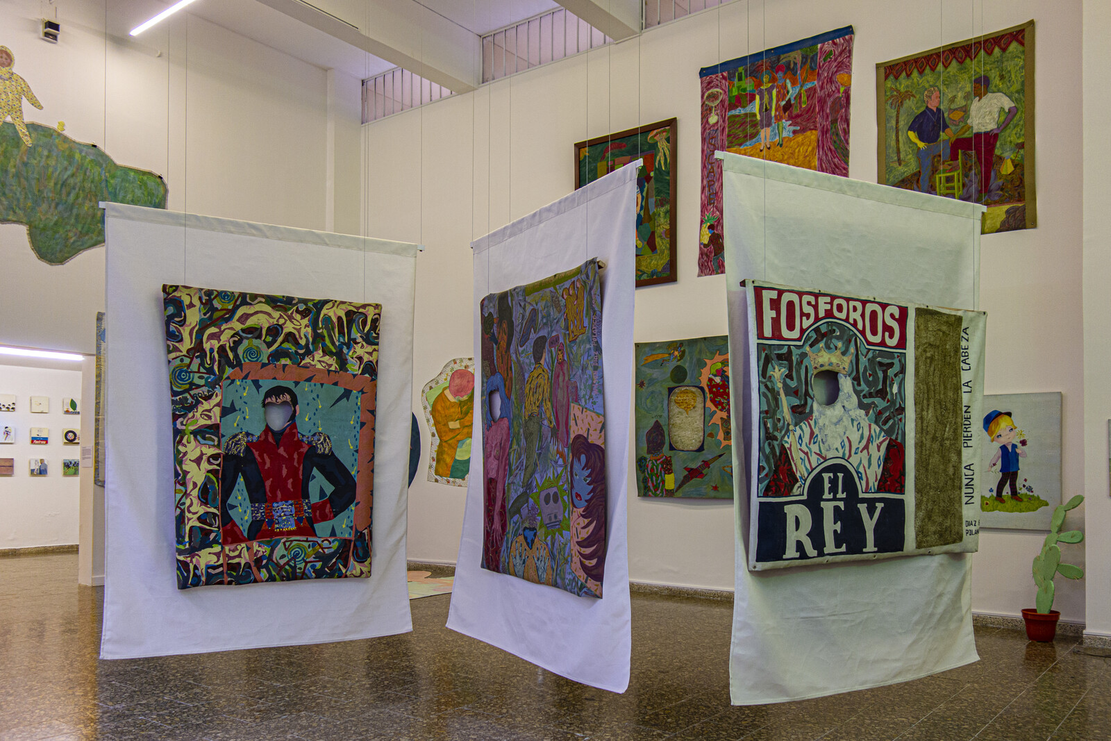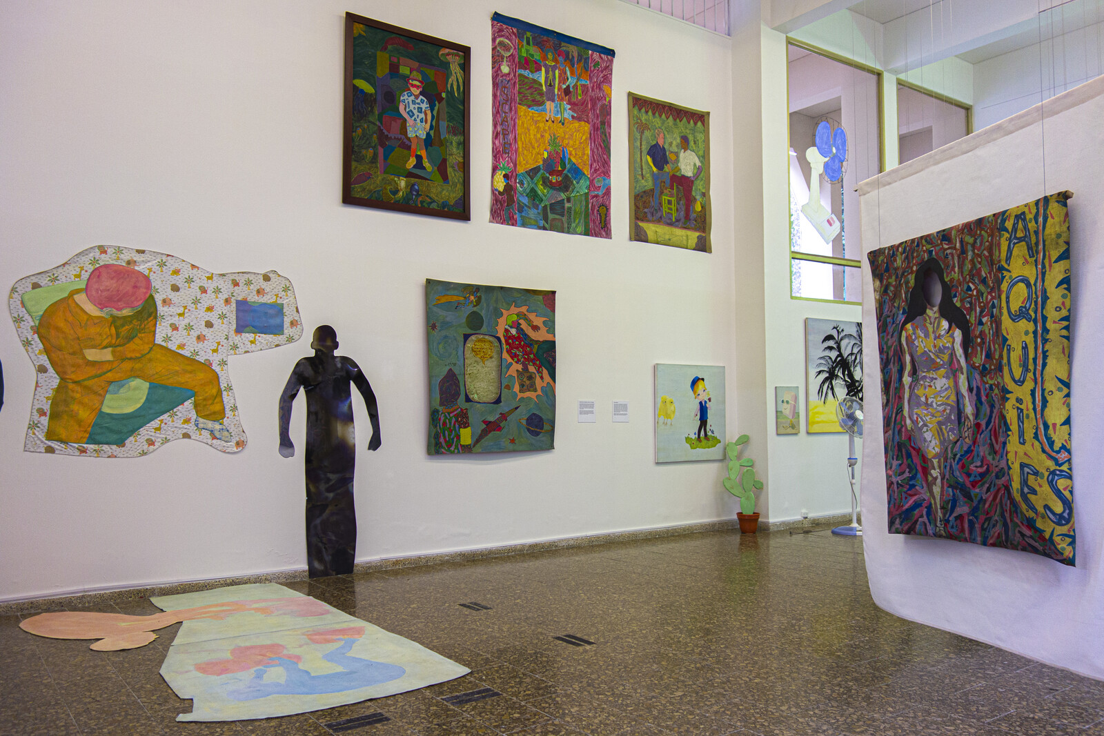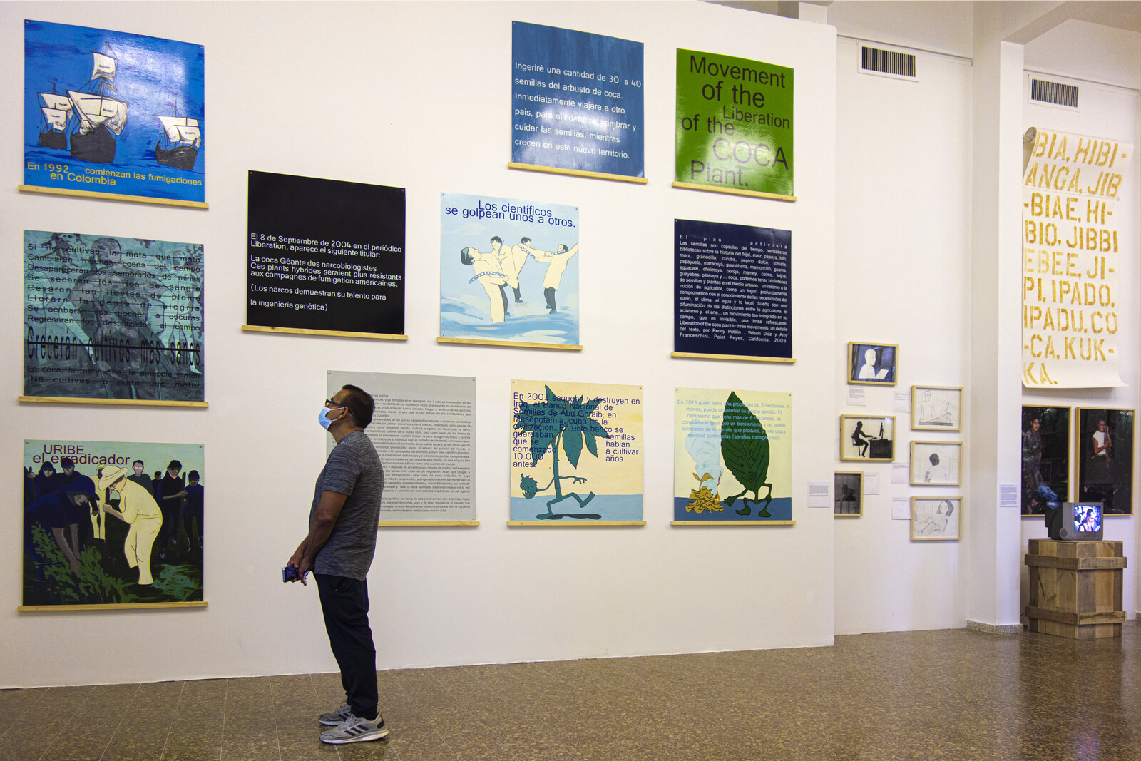Díaz’s solo show at Cali’s Museo La Tertulia mostly comprises paintings and drawings, whilst the exhibition’s layout makes use of immersive installation. A line of newspaper clippings, reproduced on one-to-one scale with adhesive vinyl, covers several walls with images including military generals and politicians in staged photo-ops. One story describes a director of police intelligence who is also an amateur painter, depicted with smock and easel in his living room. Above are two small black-and-white easel paintings: one of Pablo Escobar, another of a military jeep surrounded by dead bodies—a reference to a 1989 state-sanctioned massacre at La Rochela, in which fifteen judicial officials investigating war crimes were killed.