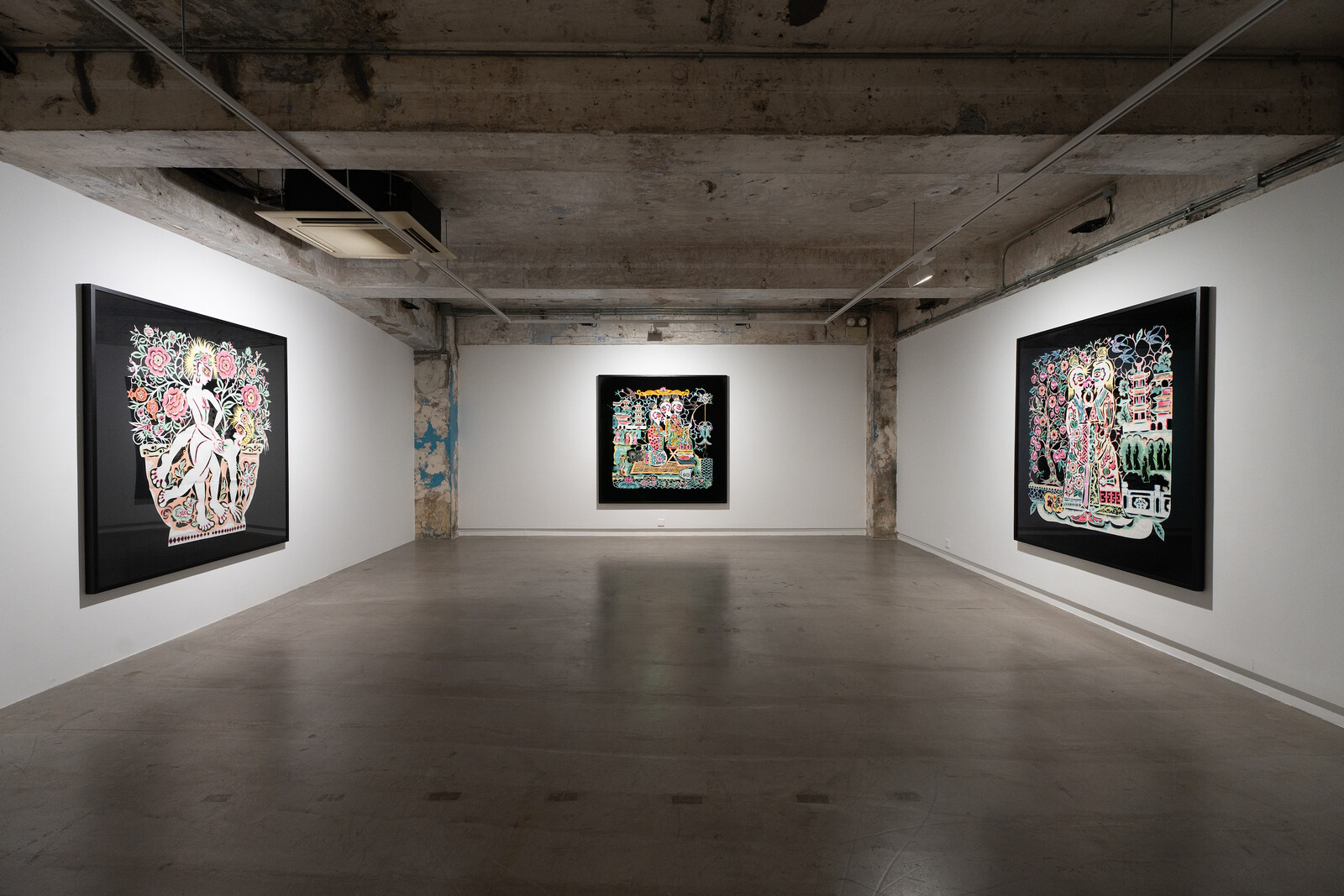 There’s a mythological aura to Xiyadie, who learned the ancient matrilineal folk art of paper-cutting from his mother while growing up in China’s Shaanxi province. The artist’s name means “Siberian Butterfly,” an insect known for its beauty and resilience. He gave it to himself in 2010, when the Beijing LGBT Center invited him to show his work to the public for the first time, five years after he moved to the Chinese capital as a migrant worker to support his family. Before that 2010 show, the artist’s paper-cuts, created using Xuan paper and luminously pigmented with natural dyes, were private portals into a closeted world: an entanglement of diaristic records of clandestine gay affairs and fantasies of living a freely queer life. Since then, he has exhibited internationally (notably in the curated exhibition at this year’s Venice Biennale) but less so domestically, making this exhibition in Hong Kong—the artist’s largest to date—an important milestone.