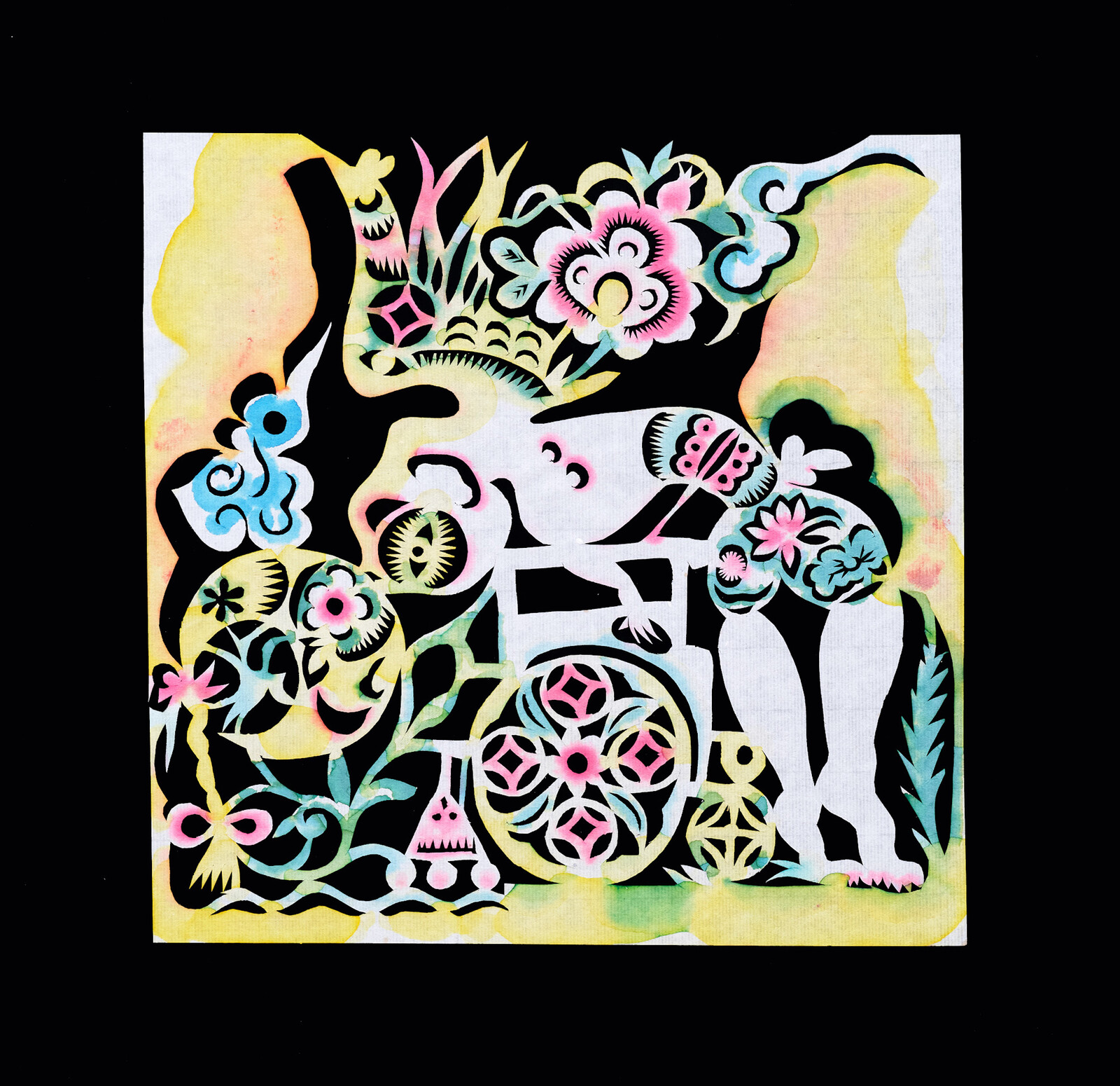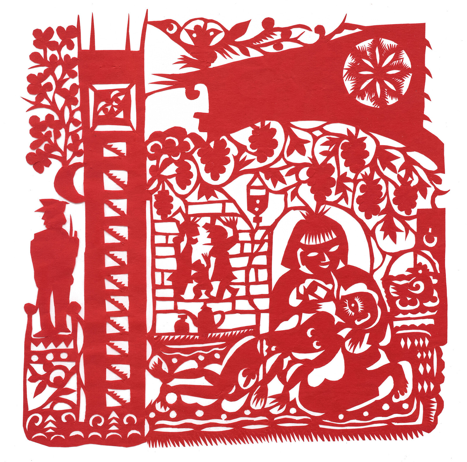 Among the earliest papercuts in “Butterfly Dream” is Train (1985–86), which recounts one of Xiyadie’s first sexual encounters with a train attendant while en route to Xi’an. Mounted on black velvet, a large, square image plane is defined by a central train carriage in which an arched-back Xiyadie, whose naked body is covered with flowers on leafy vines, falls into the arms of his uniformed paramour. Their legs morph into coupling rods that connect to the bar linking the train’s wheels below; it’s a visceral unison, in which man and machine find harmony in rhythmic motion. Nearby, Xiyadie’s former lover appears in another large papercut, Sewn (1999), as a framed portrait positioned in front of the artist’s naked, flower-marked body, which fills a central space encircled by the characteristics of a village house. Sitting on the floor, his back leans on a heavy door with a lion-head doorknocker while his feet are pressed up against the brick wall in front of him. He sews the head of his penis with flame-like tendrils using a giant needle that punctures the tiled roof above: what the artist has likened to an act of breaking through tradition’s confines, much like the abundant blooms that flower around him.