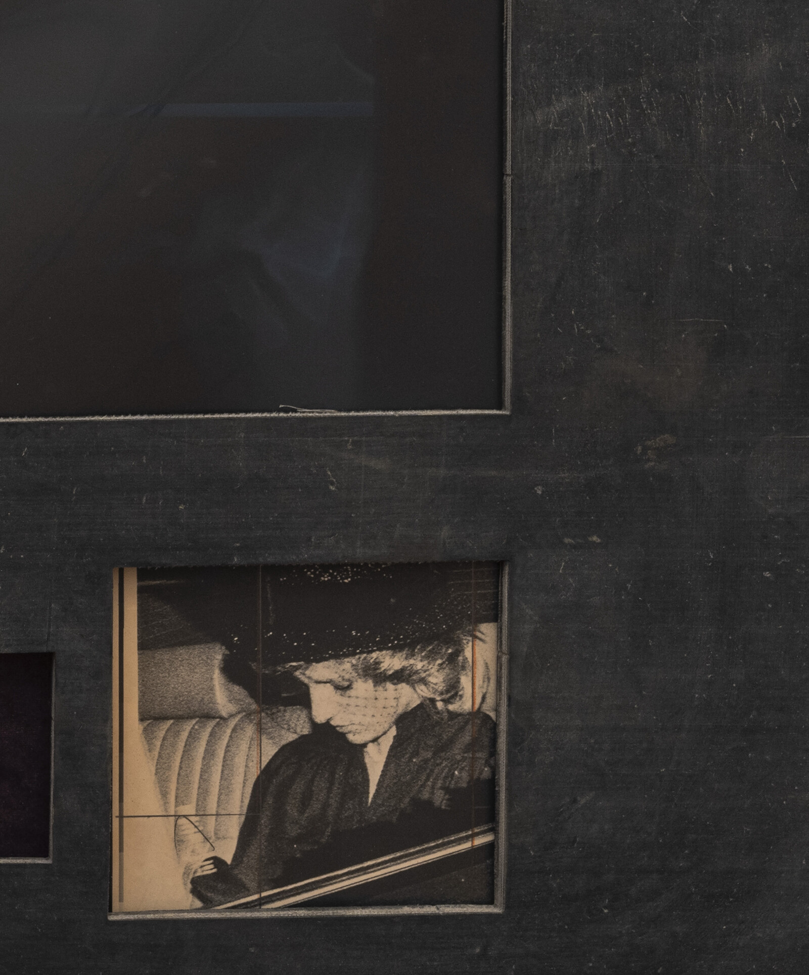 In the wall-mounted assemblage WARP NO. 1 (all works 2024), a large print of the dented front bumper of a gray jalopy looms over a much smaller black-and-white photo of a veiled Princess Diana. In light of this juxtaposition, the high-speed collision that fatally injured the English royal in 1997 seems prefigured in her downcast eyes. Both images are set in a flat, steely-gray frame that, like the old car, appears scuffed, dusty, and dilapidated but not quite vintage—decommissioned but unable to rest. In WARP NO. 2, Jalal presents an image of a crash test dummy strapped in the backseat of a car. At the bottom right of the panel, positioned like addenda, are a grimy red lens cloth advertising Harrigan Inc., a Connecticut-based home and auto insurance agency, and a photo of an actor’s face covered in special effects makeup: the stringy, mauve silicone made to mimic rotted flesh is both viscerally off-putting and inexplicably captivating.