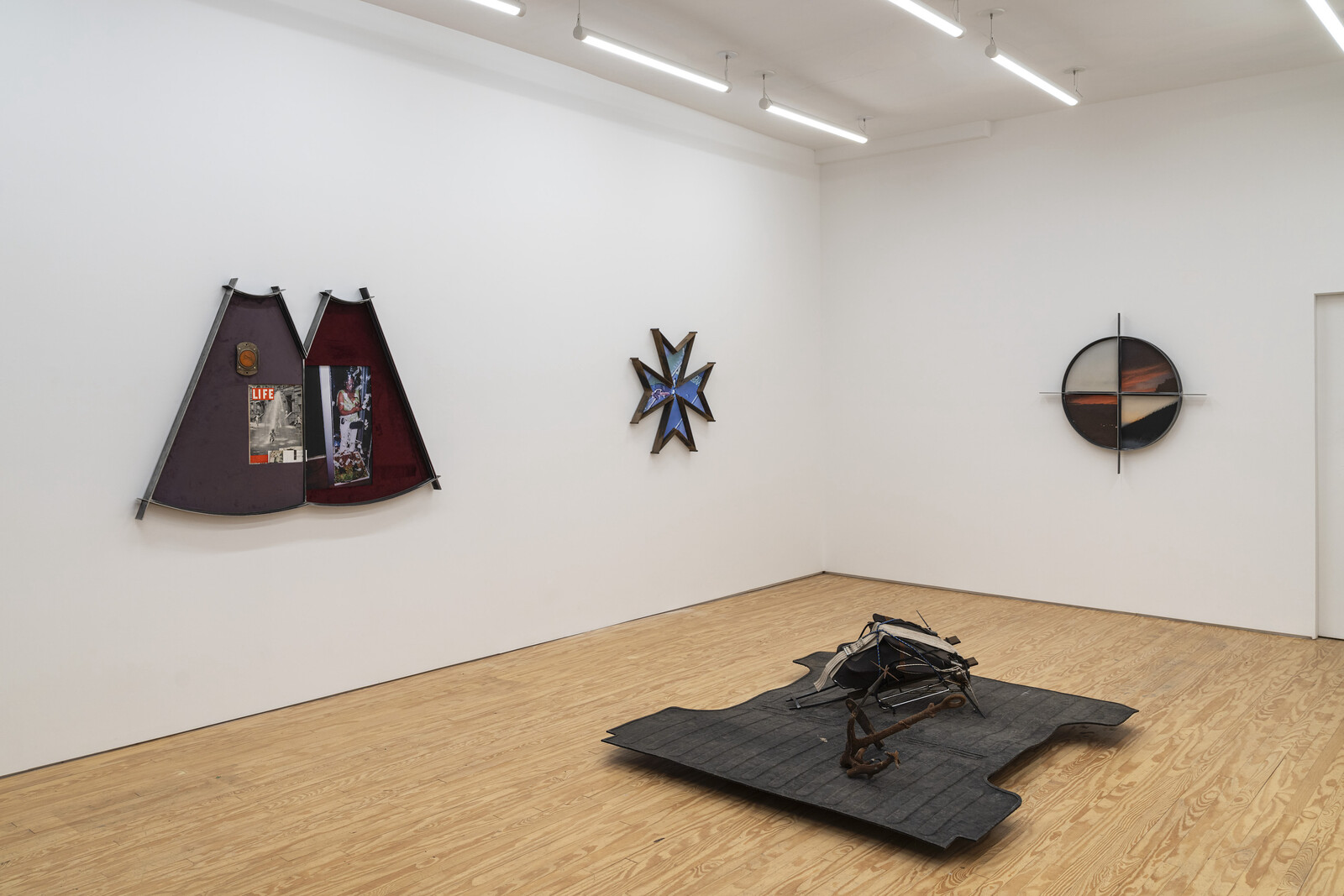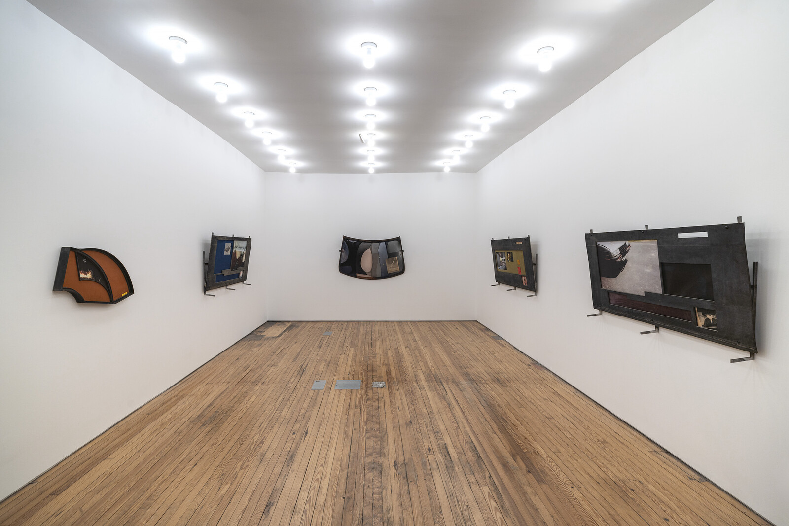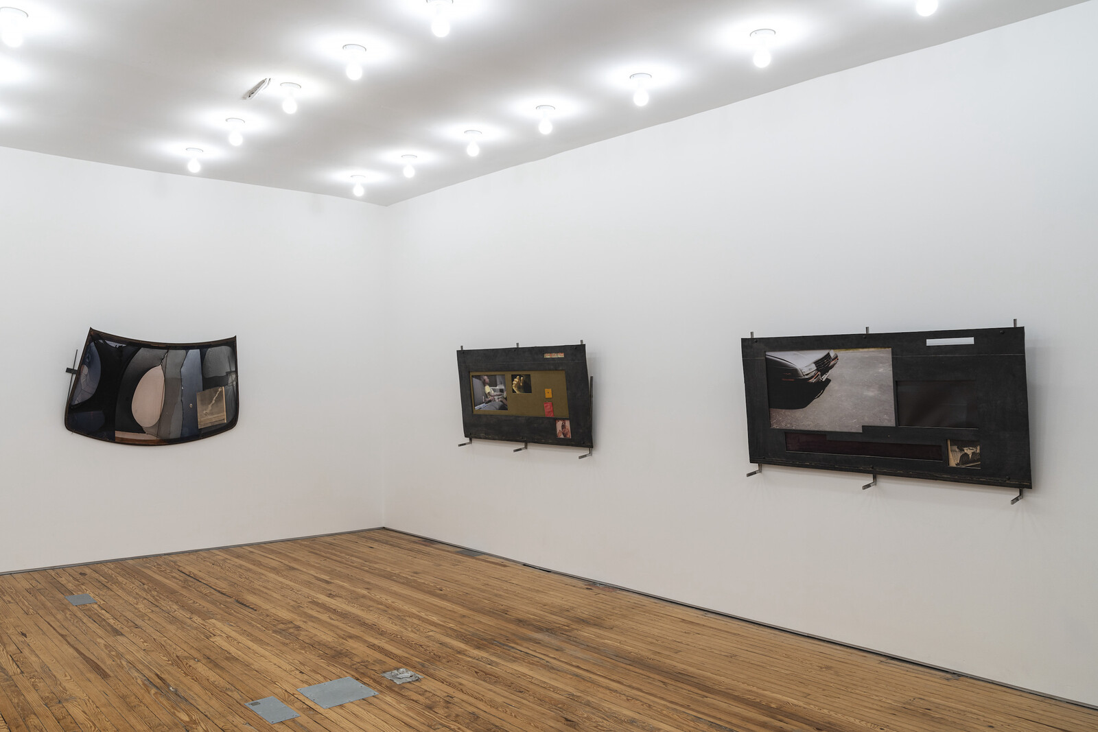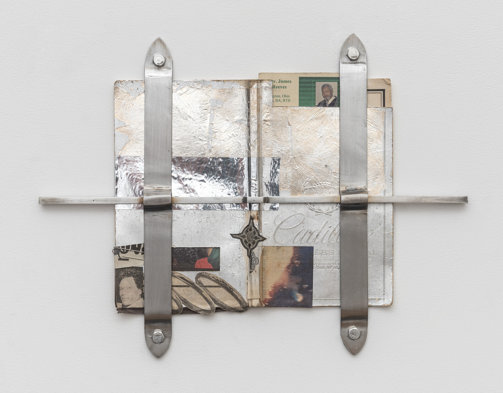Y. Malik Jalal’s steel sculptures serve as picture frames for his found photographs. Newspaper clippings, magazine covers, business cards, and screengrabs from traffic camera footage, once incorporated into the New Haven- and Atlanta-based artist’s somber color palette and subjected to his arrangements and juxtapositions, evoke an aesthetics of abjection, conjuring car accidents from which one cannot, despite one’s better judgment, look away.