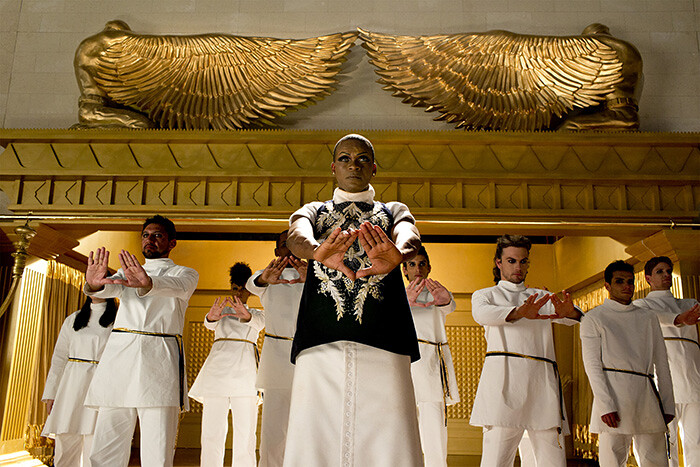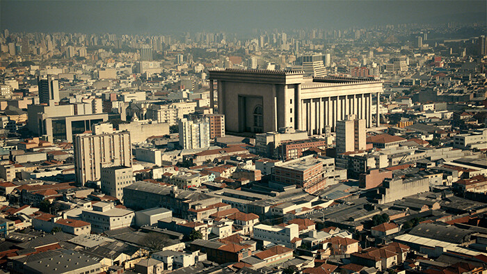 Inferno begins with an aerial survey of São Paulo’s vast urban sprawl then focuses in on one enormous building: the new Solomon’s Temple, 50 meters high and the size of five football fields, built with stones imported from Israel at a cost of several million dollars. The megalomaniacal, not to say absurd, nature of this undertaking informs the tone of Bartana’s film, which features a cast of a hundred dressed in folk costumes with towering headpieces of fruit; shots of helicopters airlifting a gigantic golden Menorah; and a host of special effects from rolling fire balls to fissuring earth surfaces, burning bodies, and collapsing architecture. With a drag-queen priest and the rousing soundtrack of the Jewish hymn Avinu Malkeinu, the bombast is complete. The disaster-movie-style destruction, mirroring the fate of the Temple’s two historical predecessors, is Bartana’s hyperbolic reaction to an already hubristic undertaking, as inferred by a recurring image of melting, Icarus-like wings.