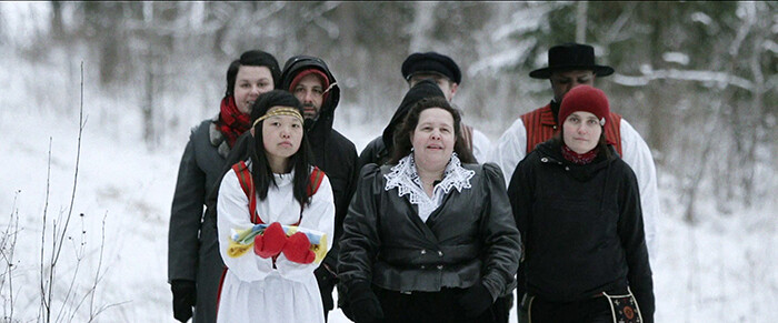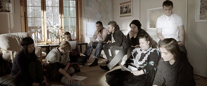 True Finn is astoundingly even-keeled in comparison. This hour-long documentary, whose title refers to the nationalist “Finns Party” (previously known as “True Finns,” and which has gained ground in recent elections), allows each of the individuals (cast by an open call) the opportunity to demonstrate their claim to the title of “True Finn.” After describing their own ethnic backgrounds, they take part in a number of set pieces devised by the artist: composing the lyrics of a national anthem, designing a new flag, and giving election speeches. Differences arise but are abated through discussion (would this have been possible, I wonder, had an actual member of the Finns Party been involved?) When in the end Mustafe, a Somalian, wins the vote, it becomes clear how redundant notions of national identity based on ethnicity are now, after a century defined by migration patterns and social displacement.