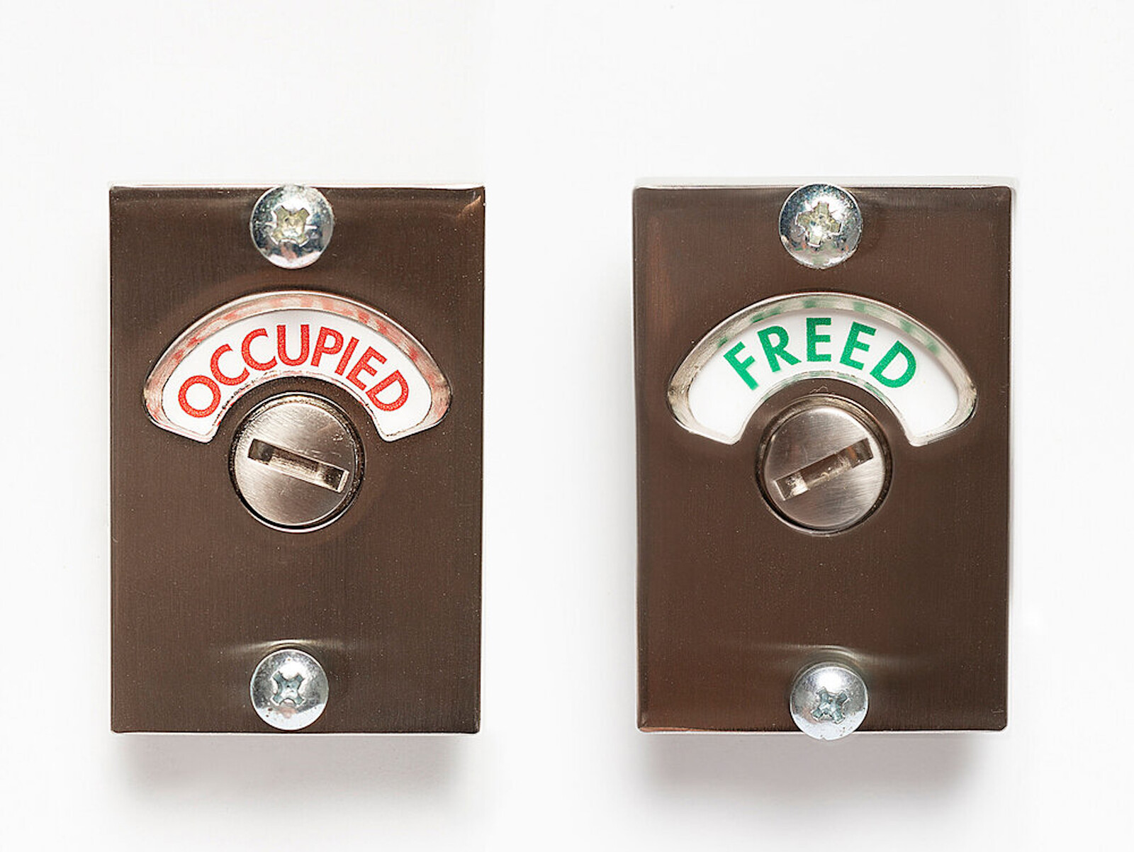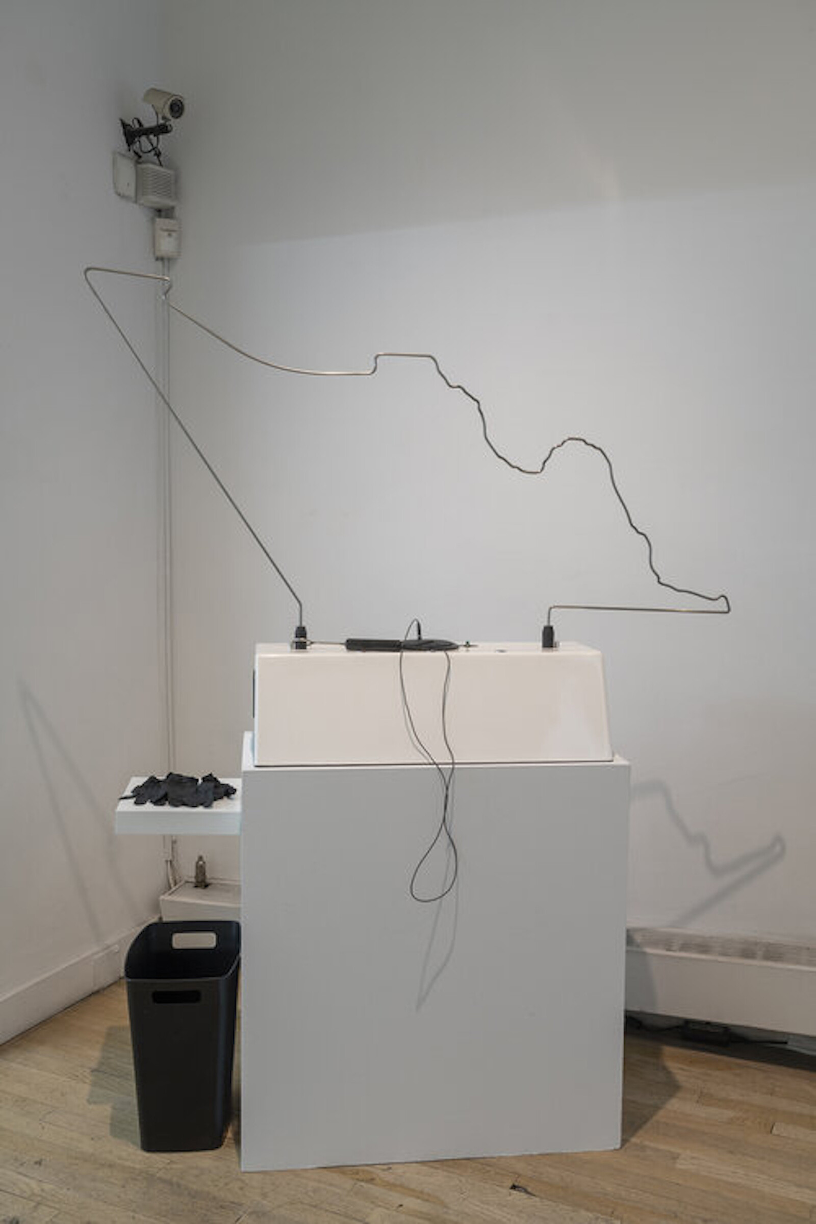 “Forms of Regulation and Control” is an exhibition conceived and reconceptualized in the wake of the pandemic; El-Sherbini’s work, usually tactile and interactive, is incompatible with our current socially distanced reality. The game “Border Control” (2017), the only pre-pandemic piece in the show, is an example of the kind of audience participation El-Sherbini usually employs. In something reminiscent of the children’s game, players must trace a charged metal wire shaped like the US-Mexican border with a circular metal tool, all the while avoiding making contact with it: if they do, they will sound off alarms and lights. And yet the way in which the exhibition has been reimagined serves to highlight the mischievous humor at the heart of the artist’s practice, now only heightened by the absurdity of “the new normal.” In “Occupied/Freed” (2020), El-Sherbini tampers with the gallery’s bathroom door, replacing the occupancy-indicator lock with her own revised labels. A trip to the toilet is thus transformed into an act of occupation, the small cubicle becoming a site of political aggression. However, in an unexpected twist, since the bathroom is closed to outside visitors for safety reasons, we are prevented from occupying and the area remains—for the most part—liberated.