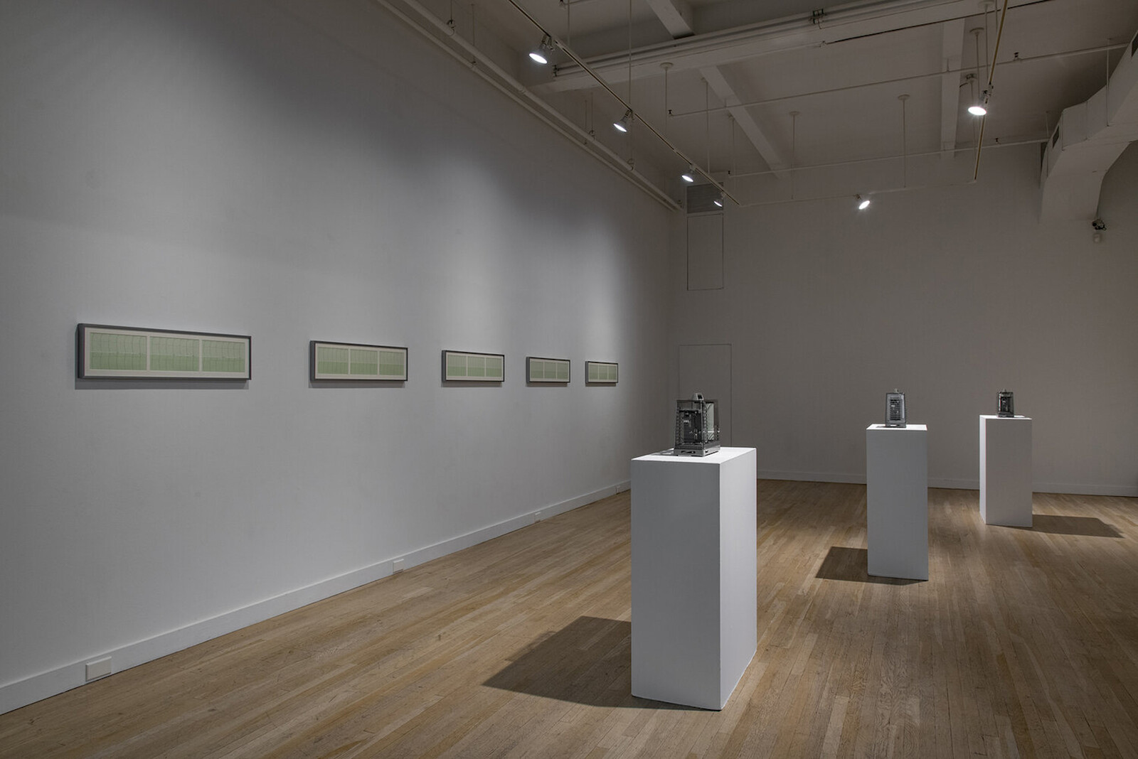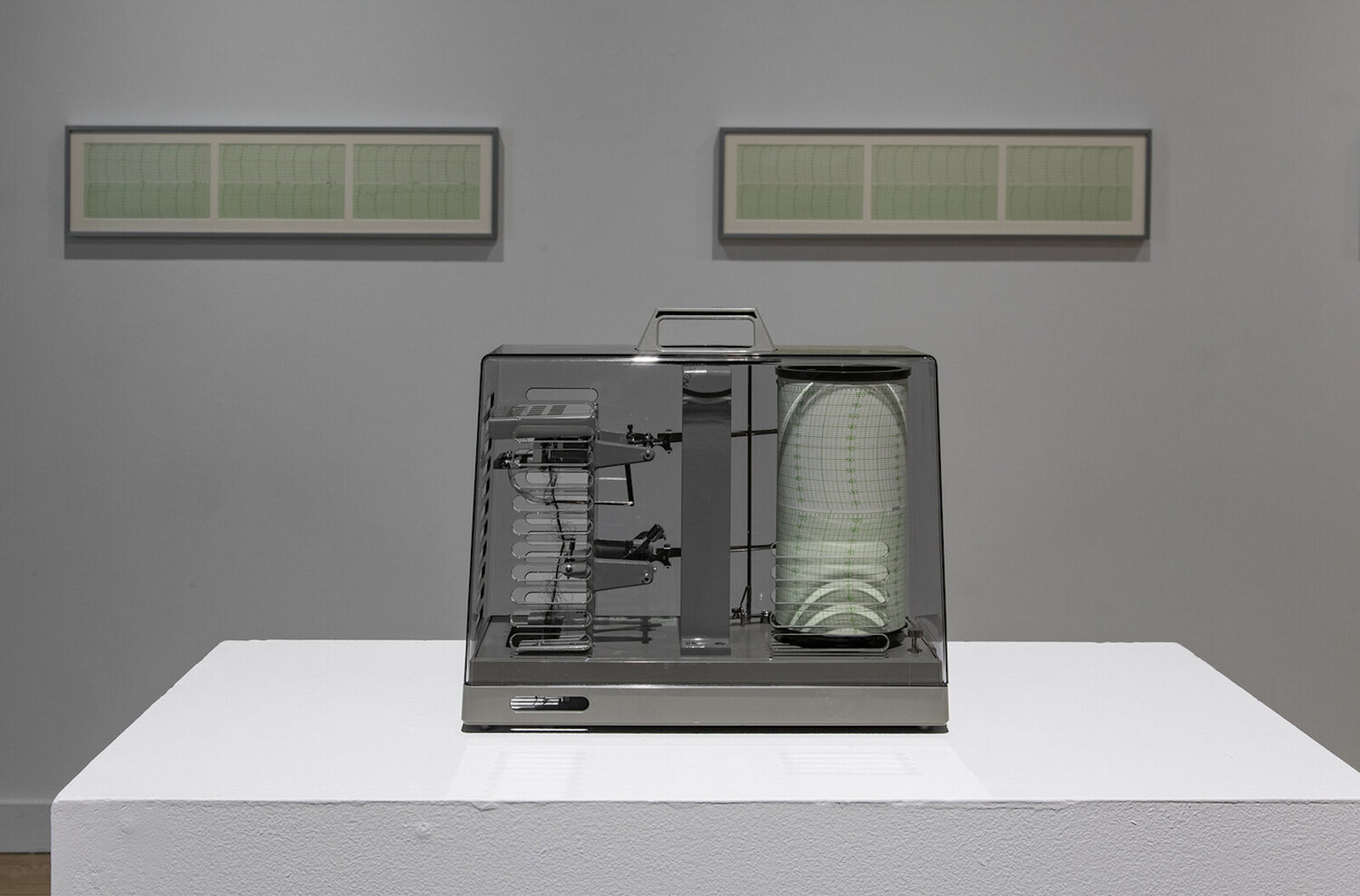 In the wake of this summer’s Black Lives Matter protests, cultural institutions, including major American art museums, have scrambled to proclaim their support for the movement—even as they laid off their own workers—by briefly giving over their homepages to diligent reassurances of their intention to address racial inequality, which for the most part merely gesture at the degree of their complicity with, and inseparability from, the systematic racism that has historically enabled their foundation and survival. In “Other Forms of Regulation and Control” (2020), El-Sherbini displaces three hygrothermographs from their usual location, hidden in the building’s margins, elevating them on pedestals placed in the center of the gallery. The gray metal machines with their plastic casing and green graph paper appear cool and clinical, giving the room a somber and serious air.