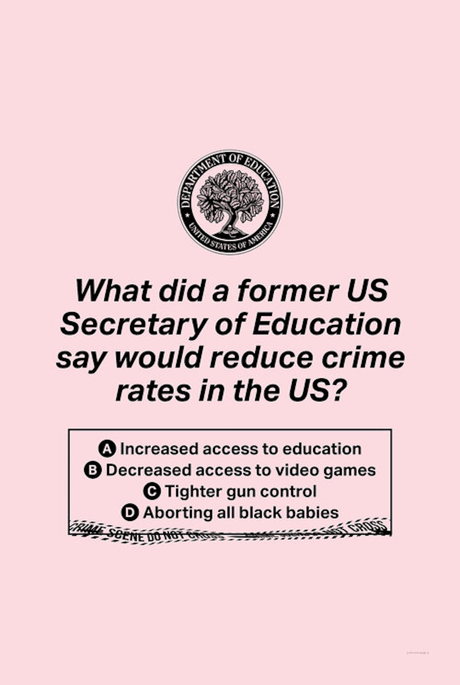 For the past decade, El-Sherbini has hosted an intermittent, roving pub quiz, writing her own questions and serving as quiz mistress. The event itself has moved to Zoom, but “Questioning” (2020) is a translation of the performance onto the gallery walls; a series of large inkjet prints featuring purported quiz questions greet visitors as they enter the space. Brightly colored, with large fonts and amateurish clipart, their aesthetic is cheerful and disarming. However, the text—questions that parody the innocuous style of trivia—present the stark realities of today’s political landscape. “What did former US Secretary of Education say would reduce crime rates in the US?” one print reads. “A: Increased access to education, B: Decreased access to video games, C: Tighter gun control, D: Aborting all black babies.” Rather than detract from her critique, El-Sherbini’s use of humor accentuates it; that D is simultaneously the only possible/impossible answer succinctly captures so much about the current moment in the US.