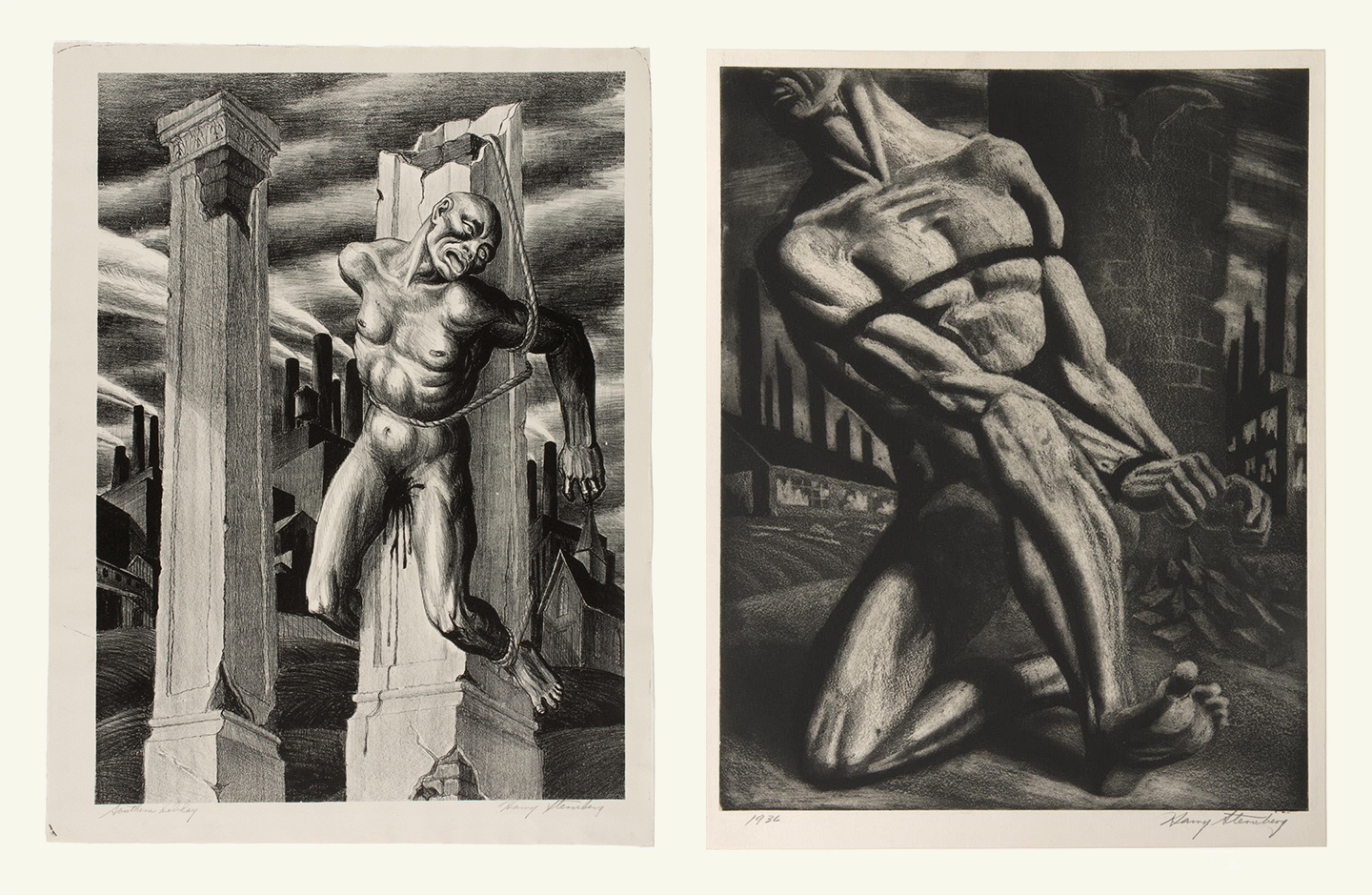 Sternberg made the biggest impact on Held. Already aligned with the values of Social Realism, Held took three courses with the left-wing artist in graphics, painting, and composition. With Sternberg, Held studied the lexicon of protest images, such as the horrors of lynching and capitalism in his lithograph Southern Holiday (1935) and the struggle for liberation in his aquatint Bound Man (Enough) (1947). The League exposed Held to new stylistic influences to help him learn not only what he would paint, but how. He became especially enthralled with the formal innovation in the work of David Alfaro Siqueiros, who torqued and twisted volumes with intense foreshortening and what muralist Arnold Belkin termed “dynamic perspective.”3 Many League students travelled to Mexico to learn from Siqueiros and assist in his projects.