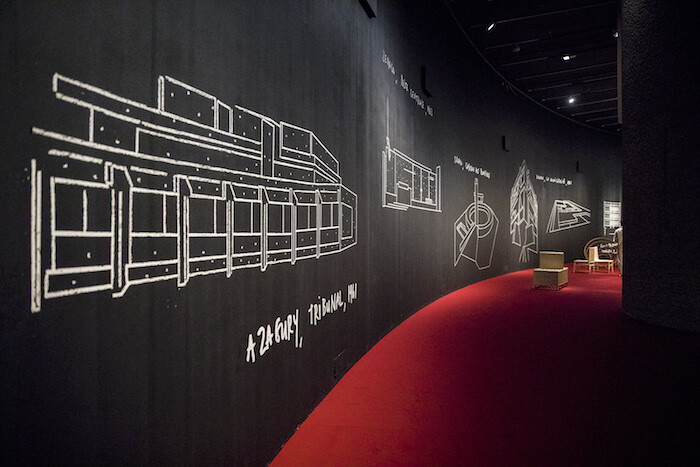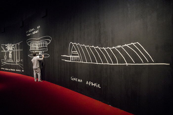 Entering the dim gallery was exciting. Its dark lighting and dramatic colors—the long curving wall painted black, the carpet beneath it blood red—recalled the set of a camp Italian horror film. (The cinematic influence is in keeping with the artist’s broader practice: in 2006, Barrada founded the Cinémathèque de Tanger, an independent project that, operating from Tangier’s Cinema Rif, is dedicated to the local and international promotion of independent Moroccan film.) On the Barbican’s curving wall are sixteen large drawings, “Untitled (Agadir)” (2018), executed by scratching broad white lines from the black paint. Referencing modernist buildings, they resemble architectural sketches crossed with children’s chalk scrawls. Nearby are pieces of rattan furniture, collectively titled “Conversation Chairs” (2018). Speakers attached to the chairs play extracts of Moroccan author Mohammed Khaïr-Eddine’s 1967 novel Agadir, concerning the earthquake and its aftermath.