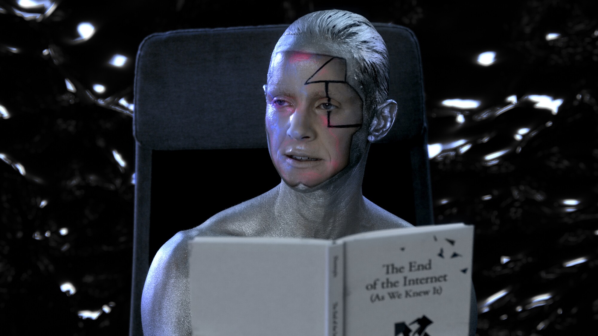 But the Randian ideal which runs throughout many of the texts that follow is that of a future, a telos motivating political struggles, technological change, and desire itself. “Jubilee 2033,” inspired by Derek Jarman’s 1978 Jubilee, presents the screenplay for a film, first shown in 2017, wherein Rand, Alan Greenspan, and his wife, Joan Mitchell, are transported to the future by an artificial intelligence programme called Azuma. In 2033 the internet has collapsed and the earth is toxic, yet still these “California prophets” predict a future where “Enlightenment dreams itself anew in software.” “Elf’s Predictions” also expresses the unstinting ability of the technological capitalism that Rand embodies to envisage a future. In this text, predictions are all an AI bot can offer. “Ask me,” it commands, “what the only path to tomorrow is.” It’s hard not to think of Fredric Jameson’s quip, made ubiquitous by Mark Fisher, that the problem of anti-capitalist politics is “that it is easier to imagine the end of the world than to imagine the end of capitalism.”1 Capitalism has monopolised the imagination of ends, of telos. If every end is the object of a desire, then our desires become that which needs to be changed by that software, dreaming itself anew.